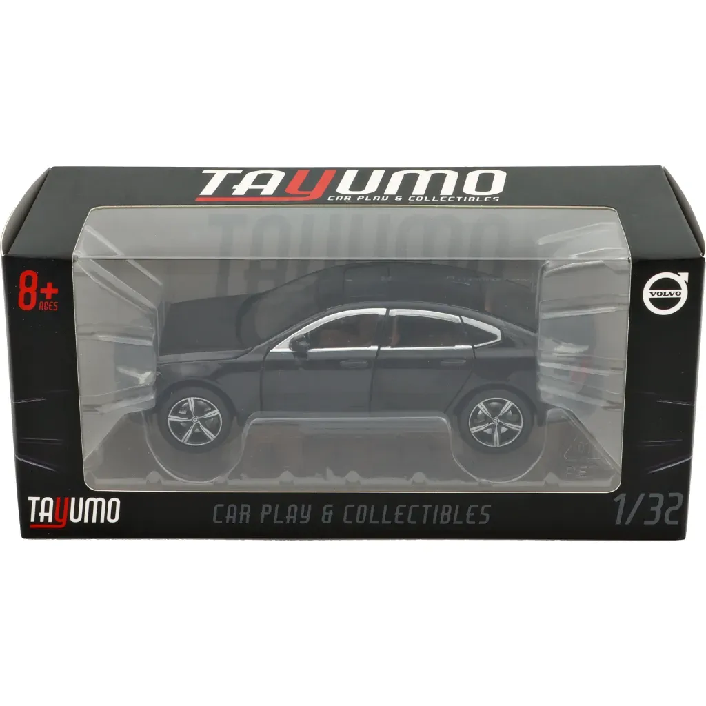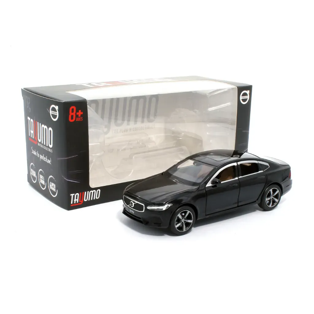 Sort (Onyx Black) Volvo S90-model fra Tayumo i skala 1:32 (15 cm). Bilen har lyd- og lysfunktioner og pullback.
