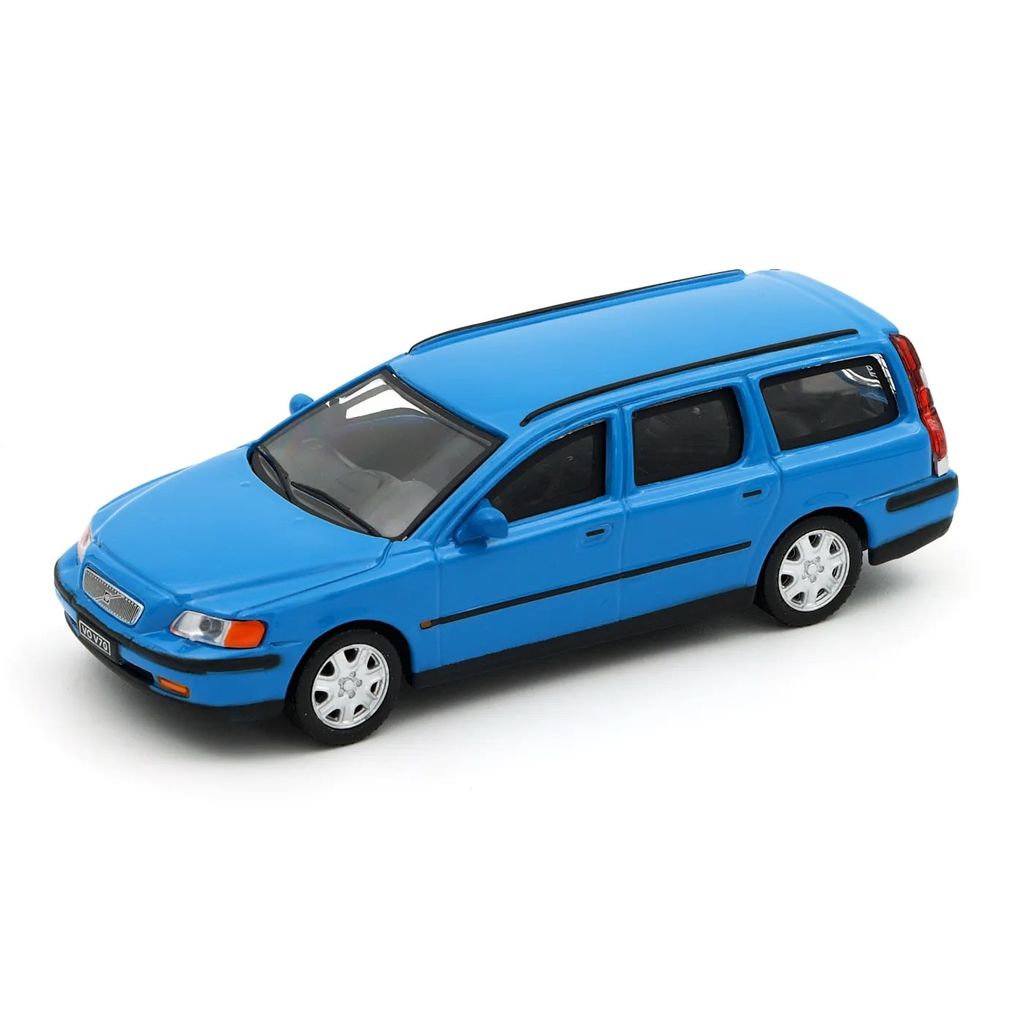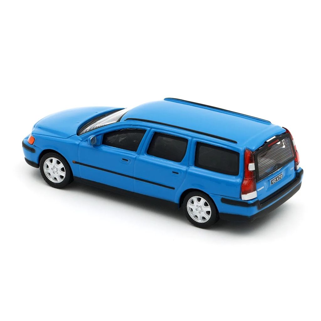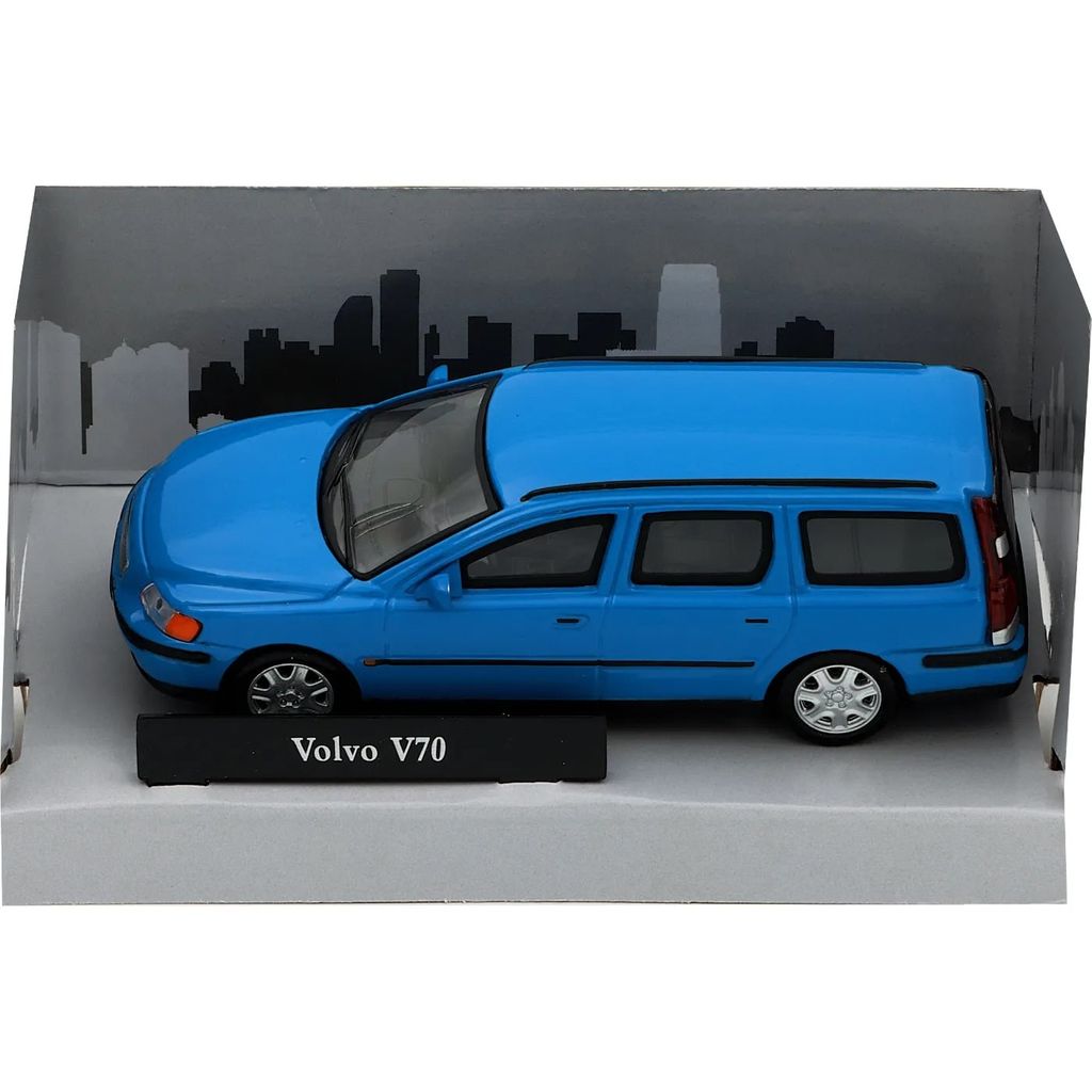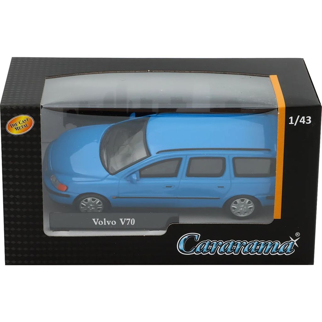 Blå Volvo V70 som model fra Cararama. Skalaen er 1:43, hvilket betyder, at denne Volvo er 11 cm. årsmodel 2008.