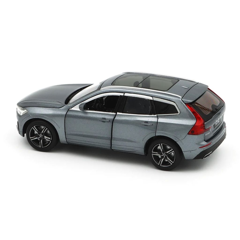 Grå (osmiumgrå) Volvo XC60-model fra Tayumo i skala 1:32 (14,5 cm). Bilen har lyd- og lysfunktioner og pullback.
