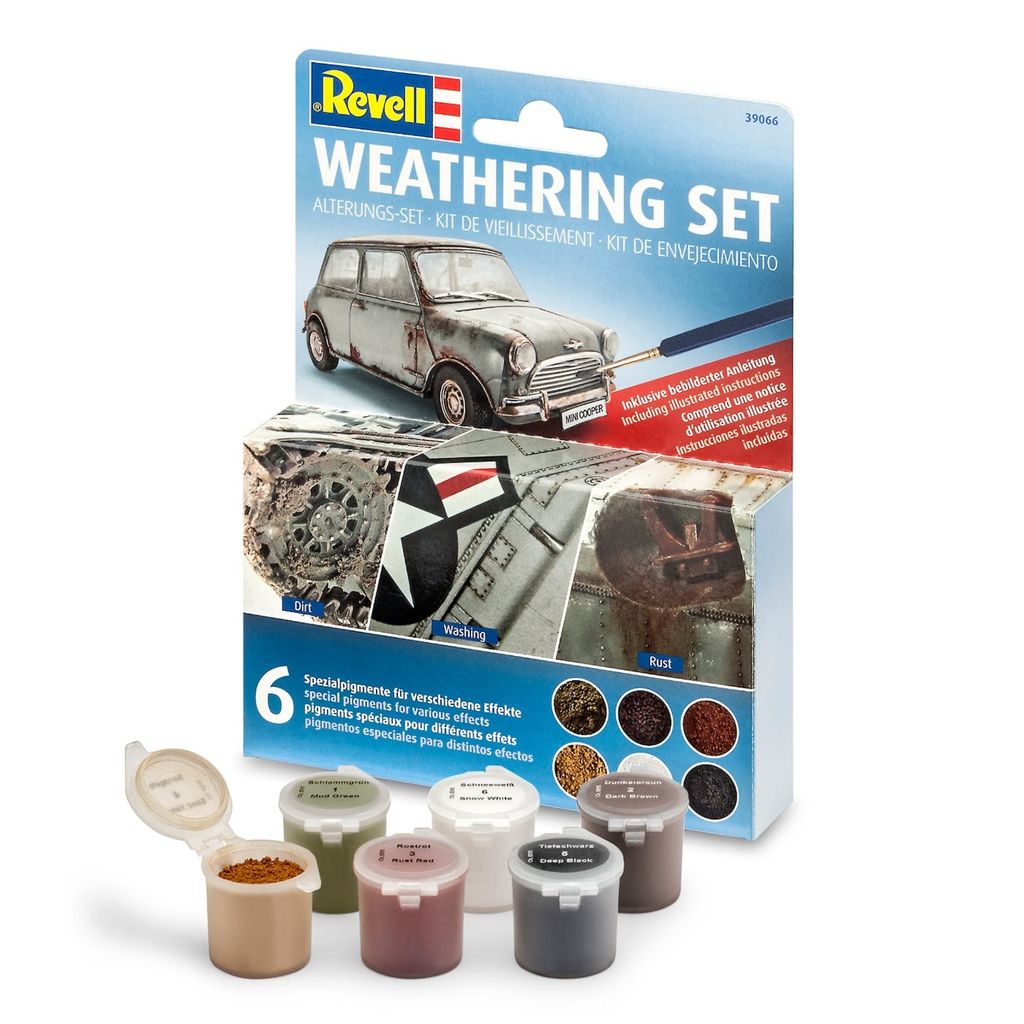 Weathering Set fra Revell er et sæt med 6 farver til at "forvitre" dine bygningsmodeller i plast. F.eks. hvis du vil male rust eller snavs for at give dine modeller et realistisk og hverdagsagtigt udseende af en brugsbil, rallybil eller lignende.