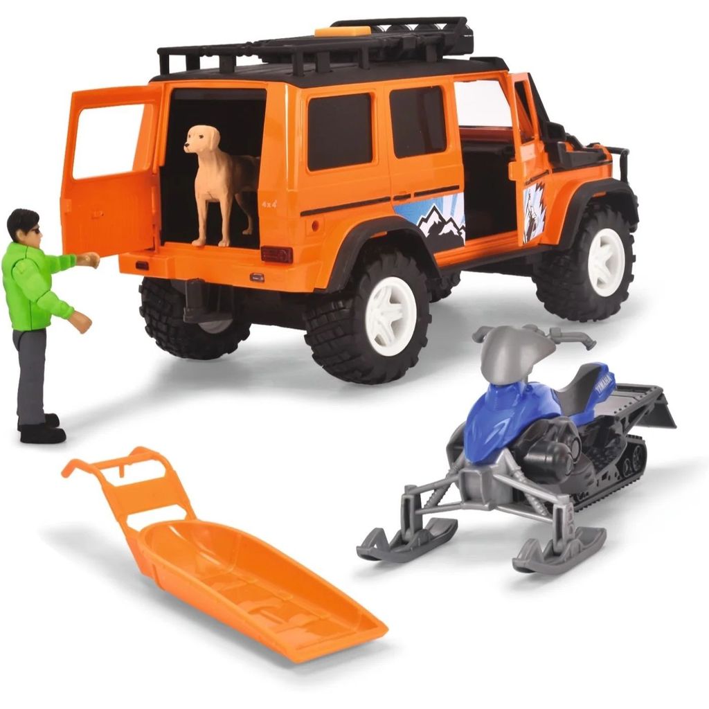 Lyd- og lyslegetøjssæt fra Dickie Toys bestående af en orange Mercedes G500 (jeep), der trækker en trailer med en blå Yamaha-scooter. Der medfølger også en bjergredder, en hund og en redningsslæde.