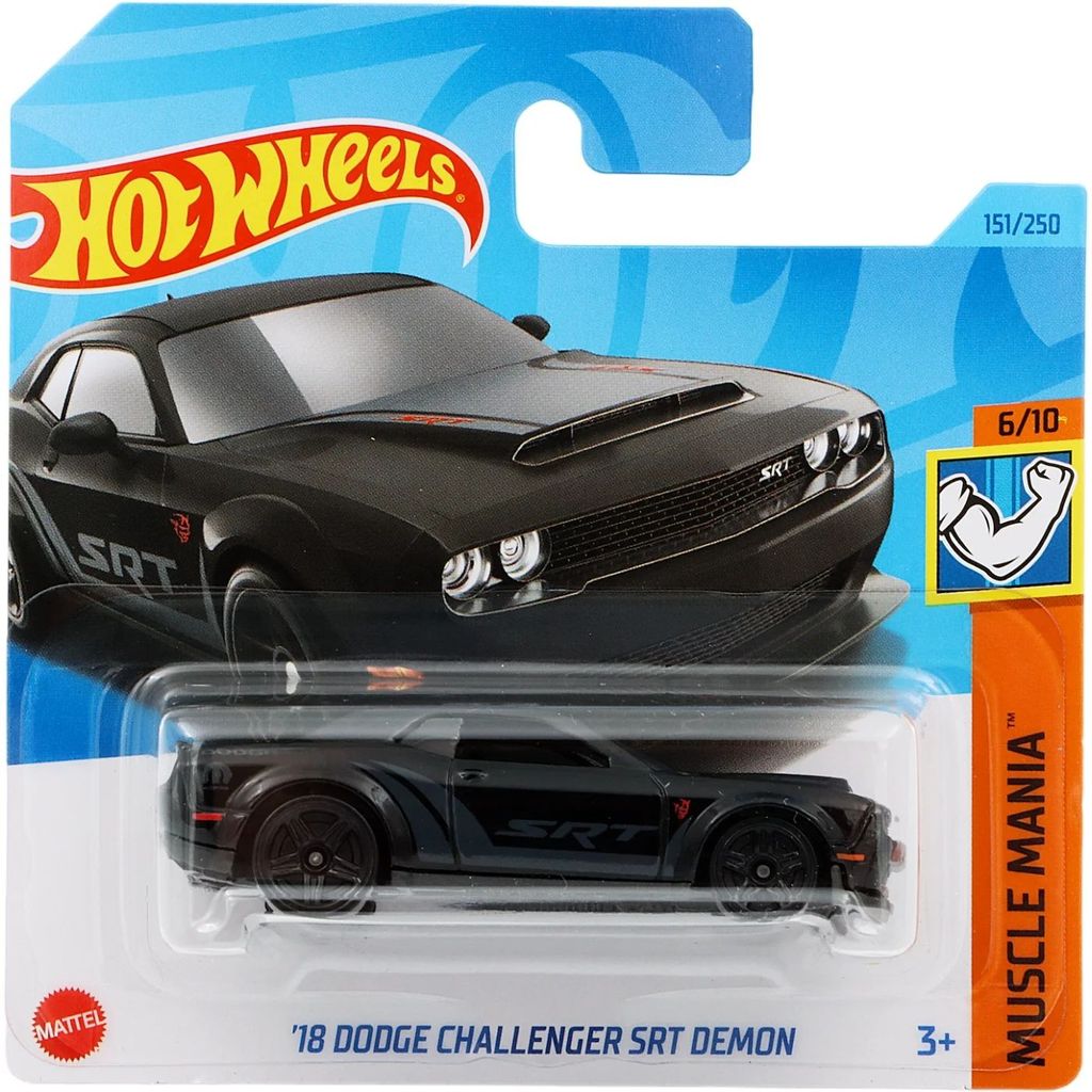 ’18 Dodge Challenger SRT Demon från Hot Wheels och serien Muscle Mania där denna leksaksbil är bil nummer 6/10. Bilen är nummer 151/250 från 2023 och har ett short card (5785). Bilens artikelnummer är HKK90. Just denna bil ingår i bland annat M case 2023.