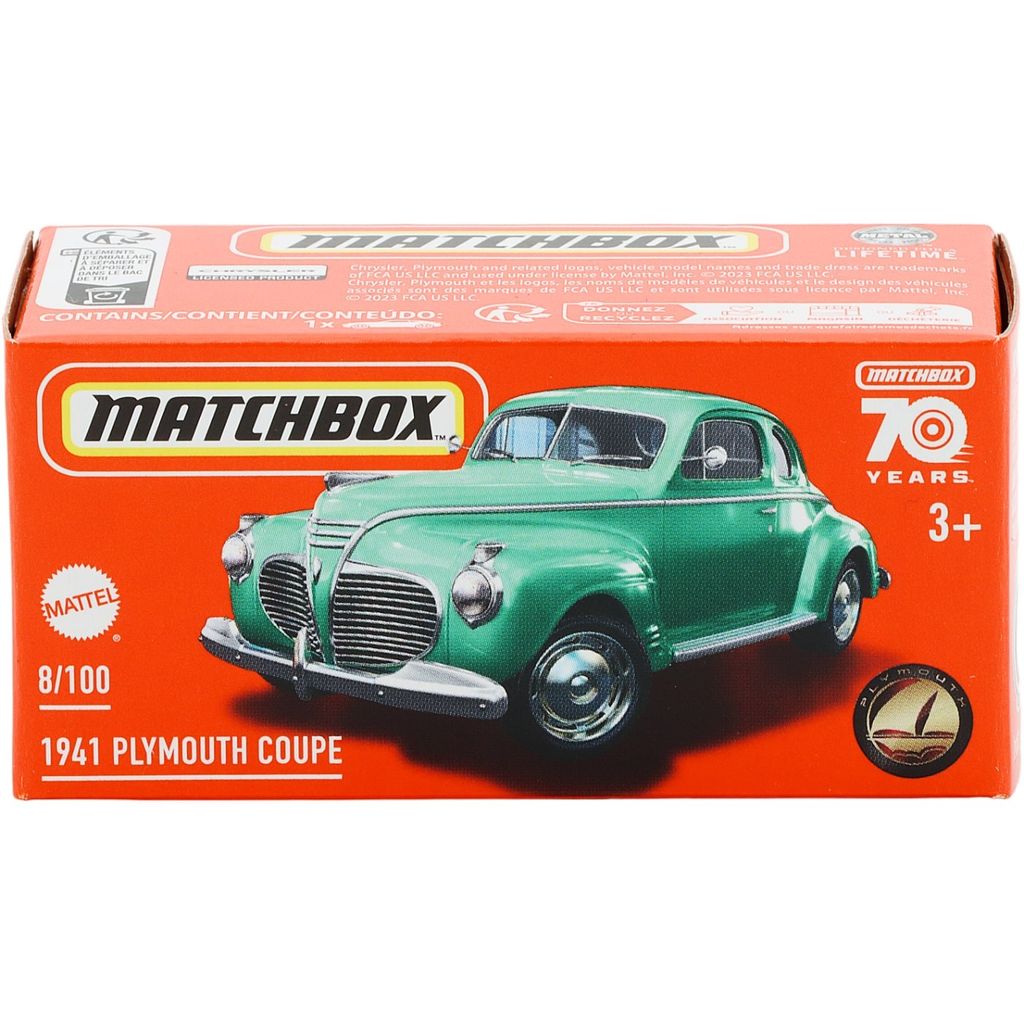 1941 Plymouth Coupe (grön) som leksaksbil från Matchbox och serien Power Grab där bilen levereras i en liten kartongförpackning.