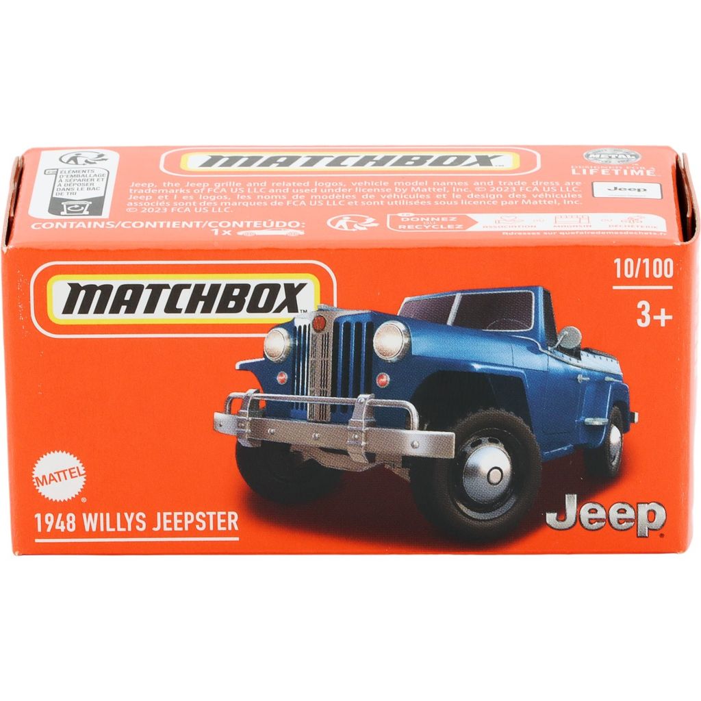 Blå 1948 Willys Jeepster från Matchbox och serien Power Grab där denna leksaksbil är bil nummer 10/100.