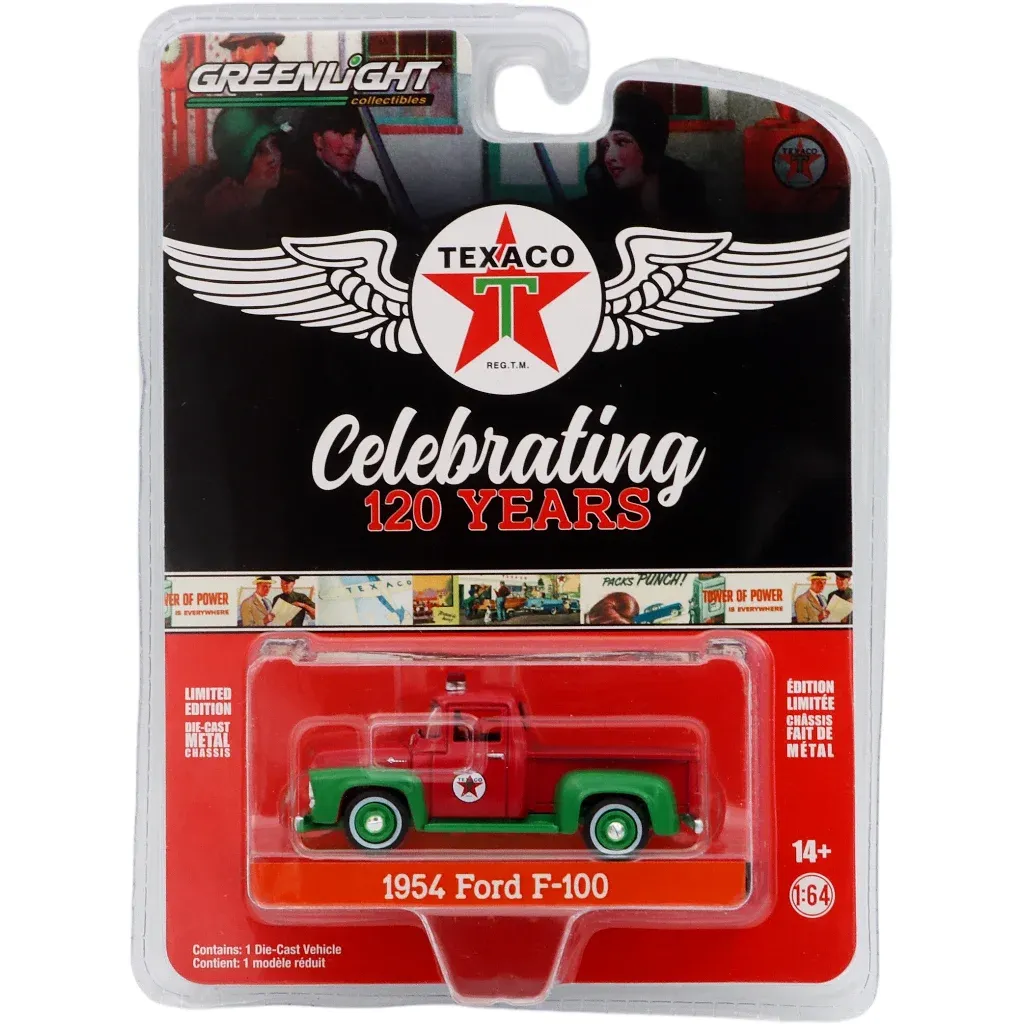 Röd och grön 1954 Ford F-100 från Greenlight. Bilen som rekommenderas från 14 år är framtagen för Texacos 120 års-jubileum.