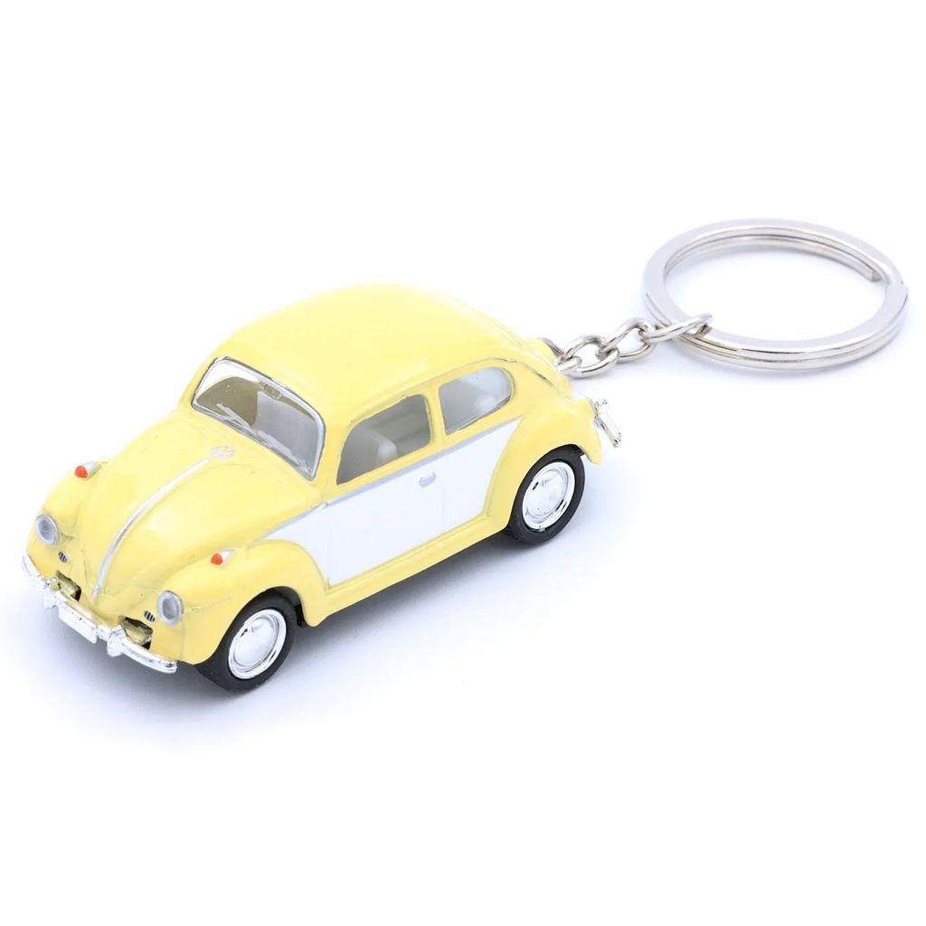 Gul 1962 Volkswagen Beetle som nyckelring från Kinsmart i skala 1:64 (längd 6,4 cm).