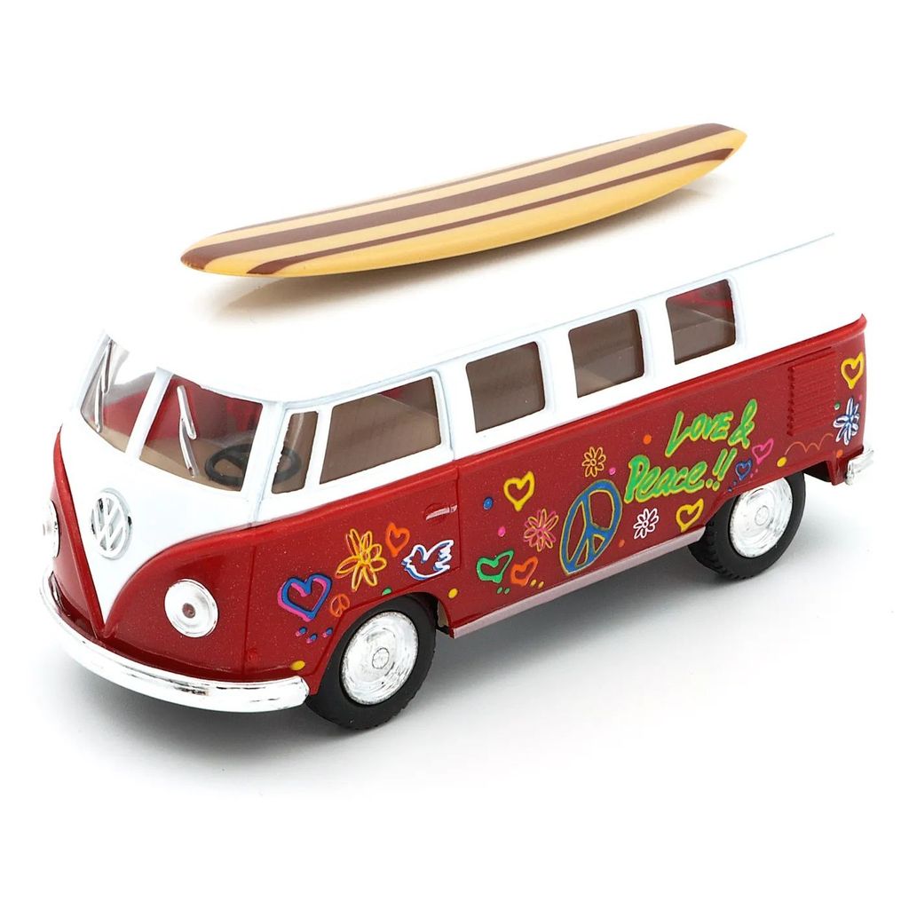 1962 Volkswagen Classical Bus med surfingbräda i trä på taket från Kinsmart i skala 1:32 (längd 13 cm). Bussen har flower power-tema.
