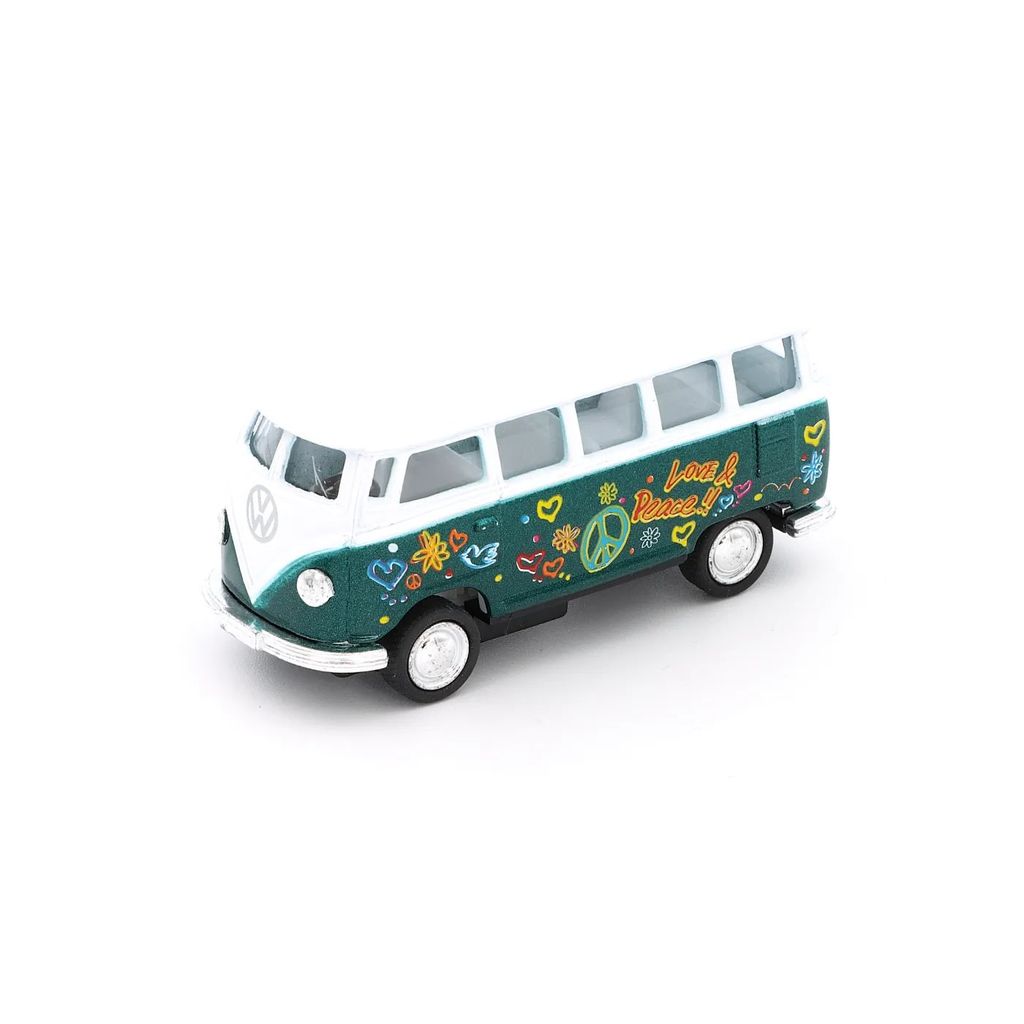 Grön 1962 Volkswagen Classical Bus Flower Power från Kinsmart i skala 1:64 (längd 6,8 cm).