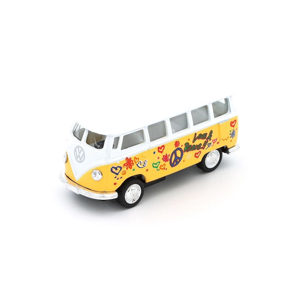 Gul 1962 Volkswagen Classical Bus Flower Power från Kinsmart i skala 1:64 (längd 6,8 cm).
