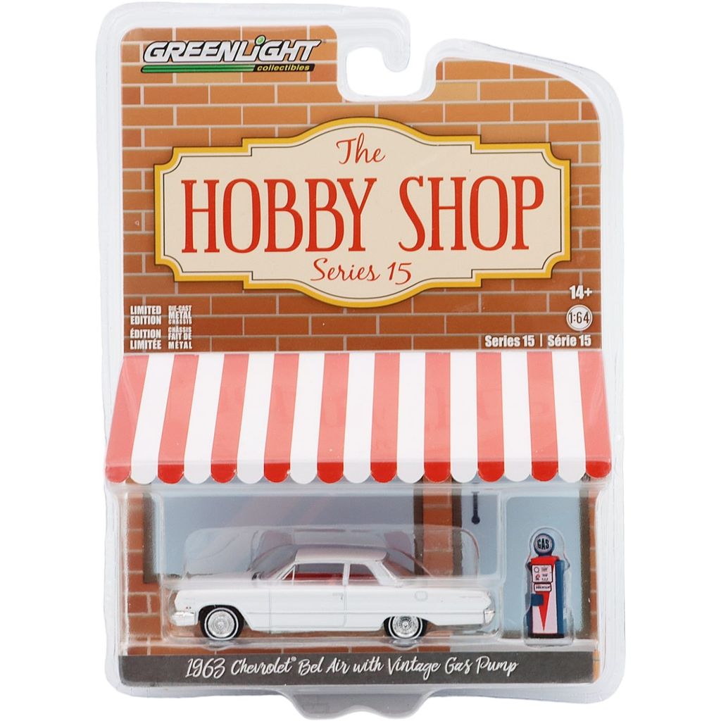 1963 Chevrolet Bel Air with Vintage Gas Pump tillverkad av GreenLight i skala 1:64 (längd 8,1 cm). Bilen ingår i GreenLights serie The Hobby Shop Series 15.