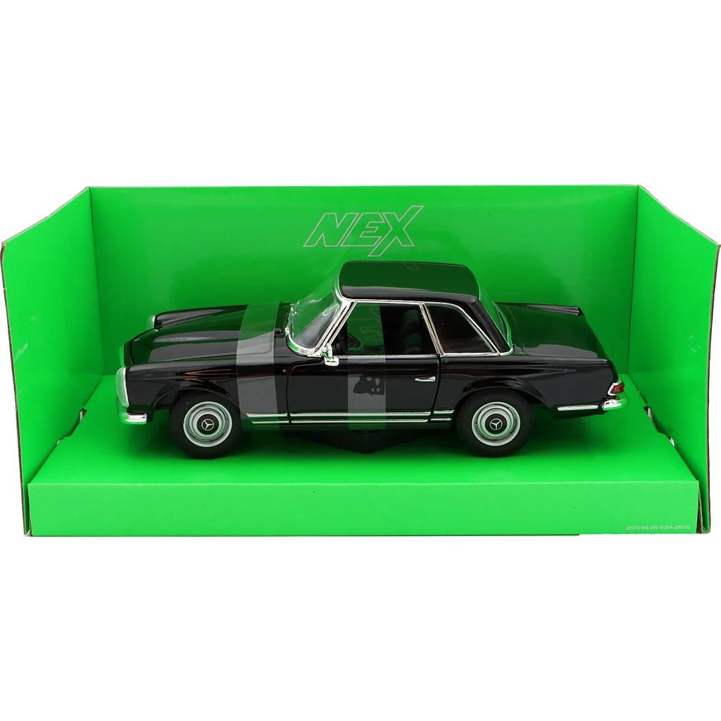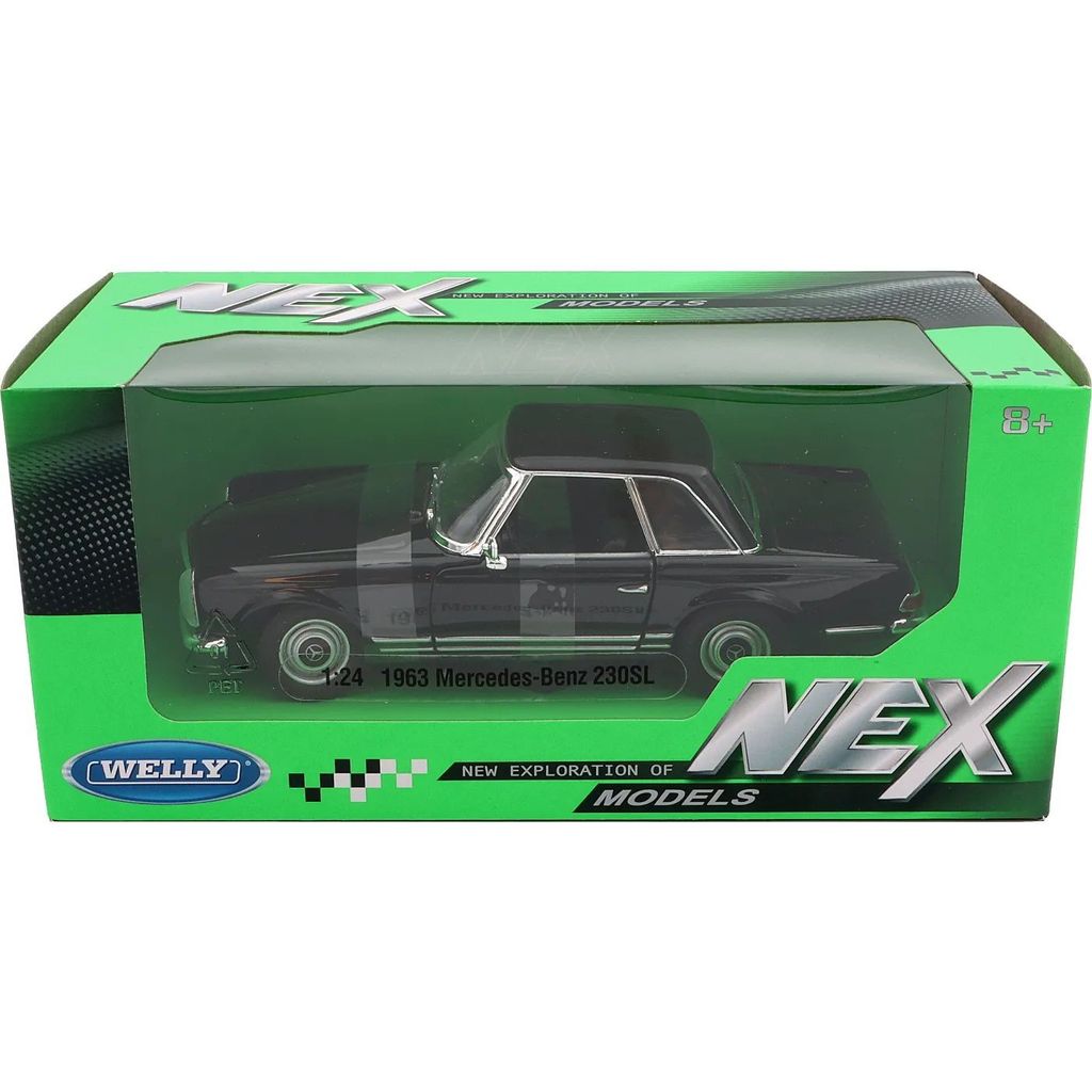 Svart 1963 Mercedes-Benz 230 SL från Welly och serien NEX Models i skala 1:24. Öppningsbara dörrar och motorhuv.