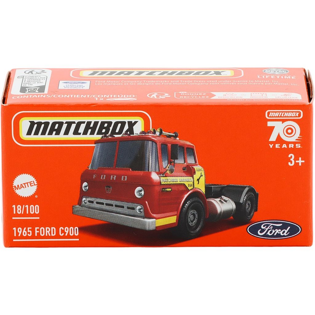 1965 Ford C900 (röd) som leksaksbil från Matchbox och serien Power Grab där bilen levereras i en liten kartongförpackning.