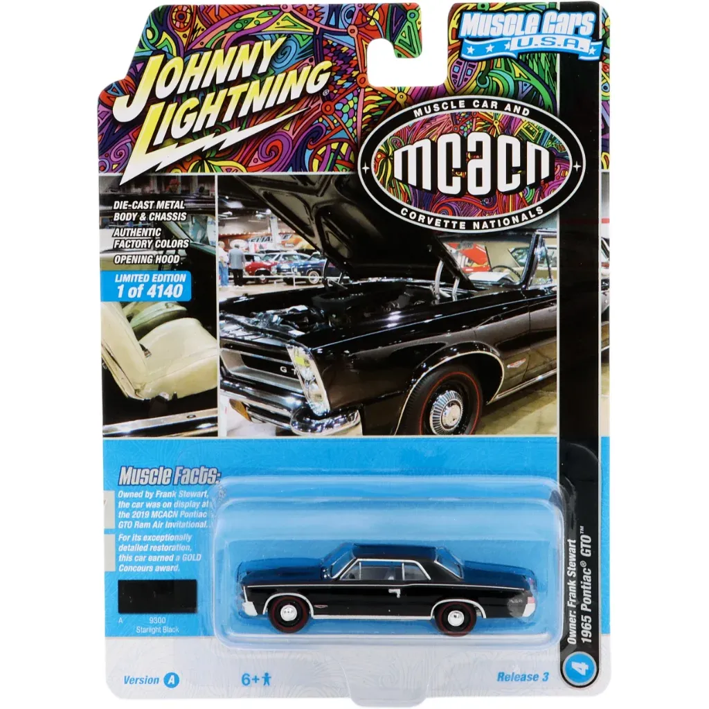 Svart Pontiac GTO, årsmodell 1965, från Johnny Lightning och serien Muscle Cars USA. Bilen är i skala 1:64 (7,7 cm).