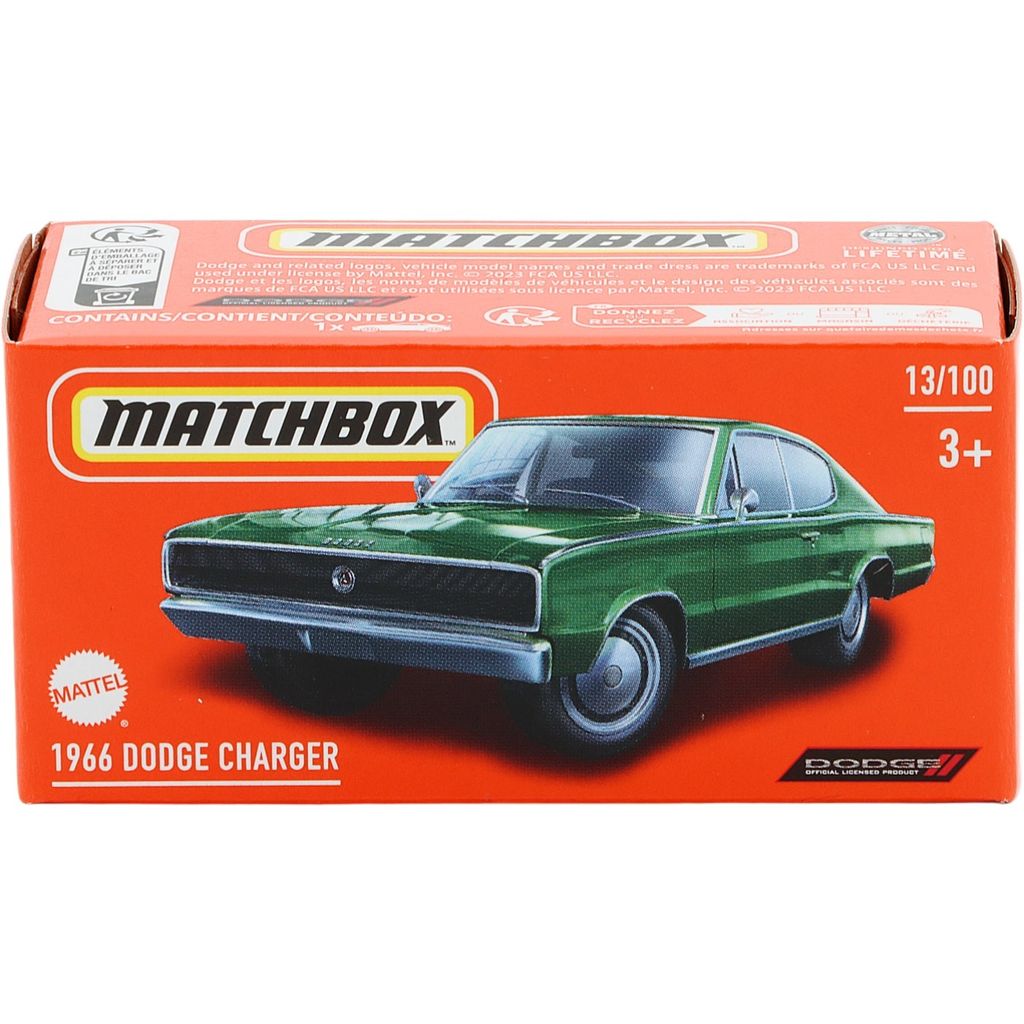 Grön 1966 Dodge Charger från Matchbox och serien Power Grab där denna leksaksbil är bil nummer 13/100.