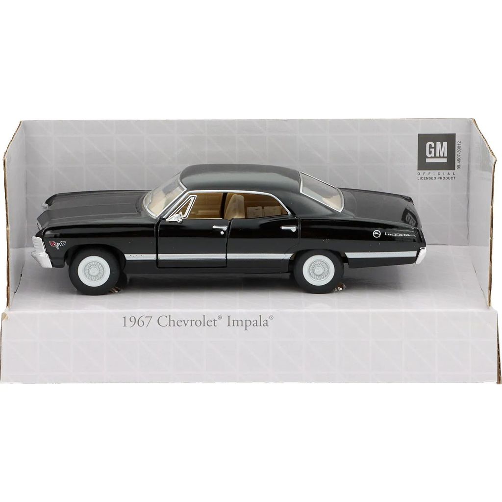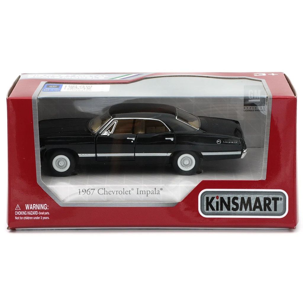 Svart 1967 Chevrolet Impala från tillverkaren Kinsmart. Skalan är 1:43 vilket i praktiken innebär att bilen har en längd på 12,5 cm.