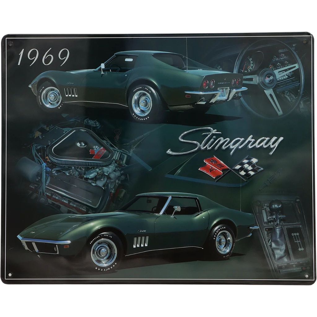 Plåtskylt med motiv av en grön Chevrolet Corvette Stingray årsmodell 1969.