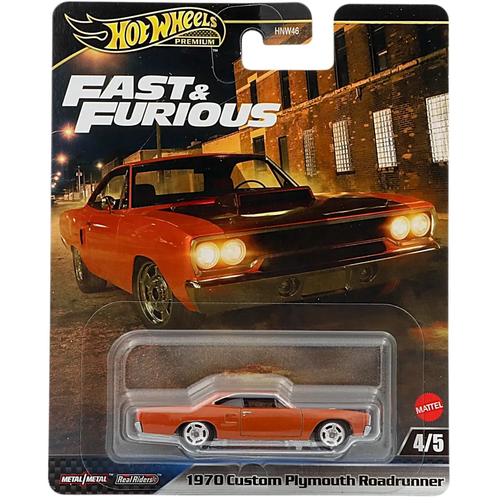 1970 Custom Plymouth Roadrunner i orange med svart motorhuv från Fast & Furious där den körts av Dominic Toretto, Letty Ortiz och Han Seoul-Oh. Bilen är tillverkad av Hot Wheels i skala 1:64 (7,6 cm).