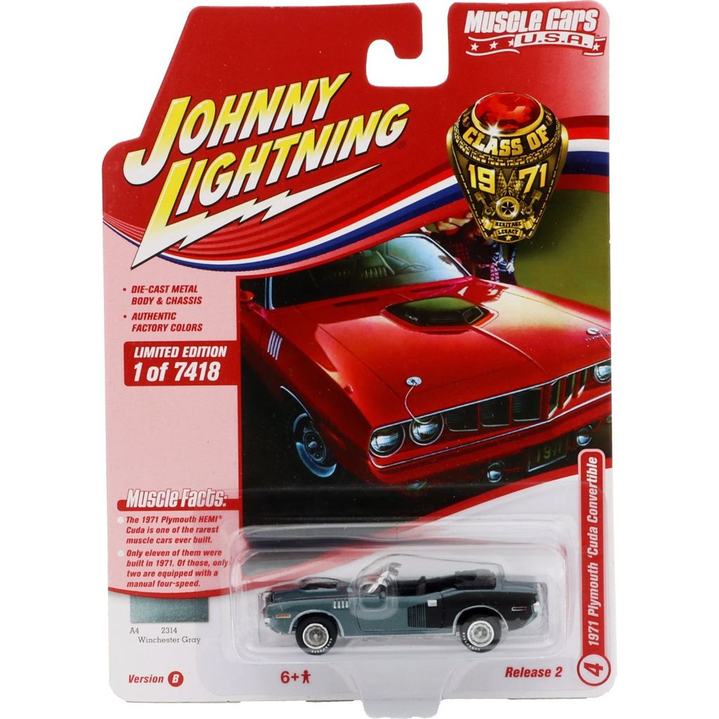Från Johnny Lightning erbjuder vi denna grå (Winchester Gray) 1971 Plymouth Cuda Convertible i skala 1:64 (7,4 cm). Bilen ingår i serien "Muscle Cars USA".