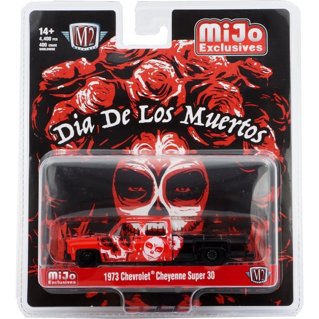 Svart och röd 1973 Chevrolet Cheyenne Super 30 från M2 Machines i skala 1:64 (10,5 cm). Bilen är en utgåva för Dia de los Muertos (De dödas dag) som är en mexikansk högtid.