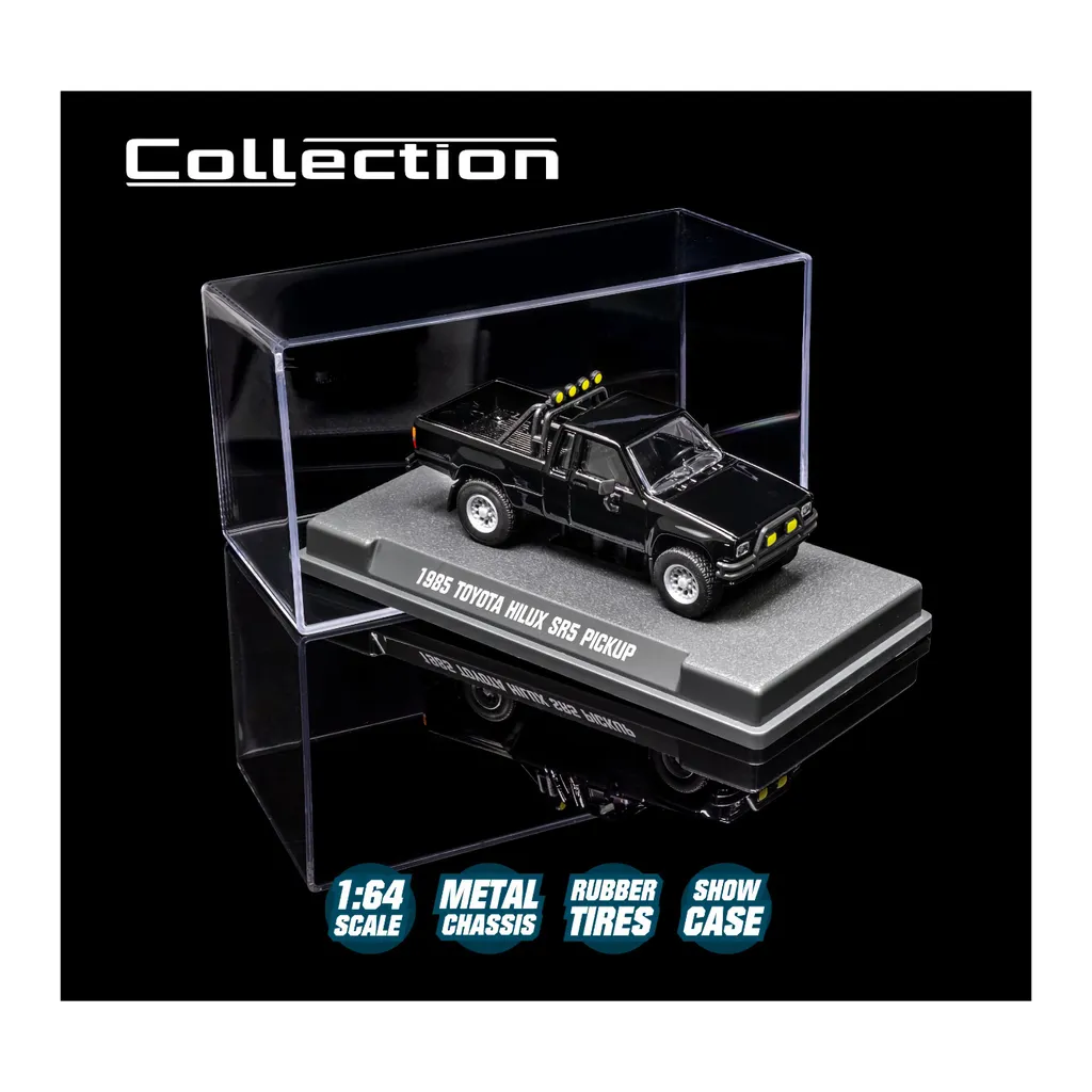 Bilen levereras stående på en svart bottenplatta med en täckande akrylbox (show case). På plattan anges modellens namn "1985 Toyota Hilux SR5 Pickup" i silver.