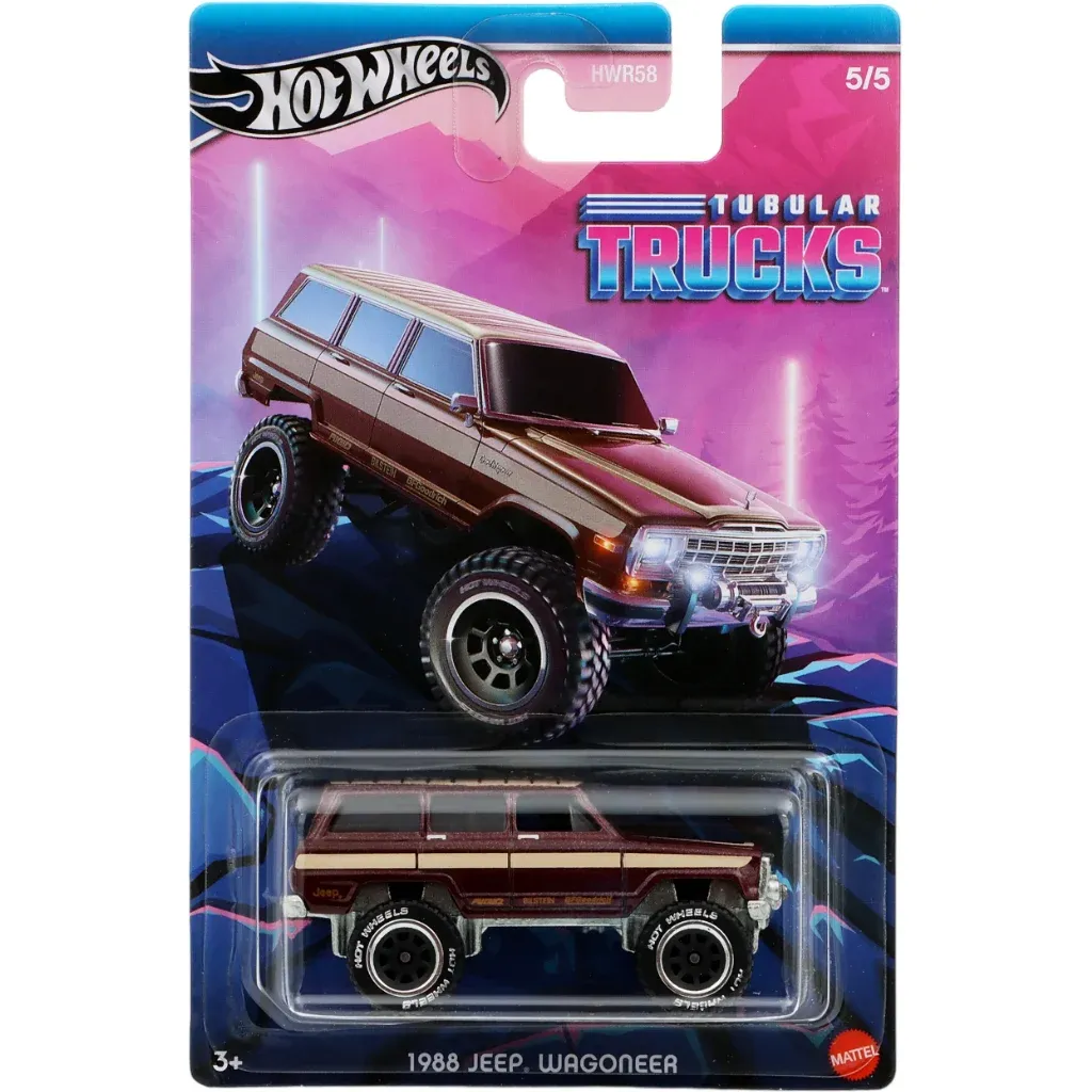 Vinröd (metalliclack) 1988 Jeep Wagoneer från Hot Wheels och serien Tubular Trucks från 2024 där denna offroadjeep är bil nummer 5 av 5.