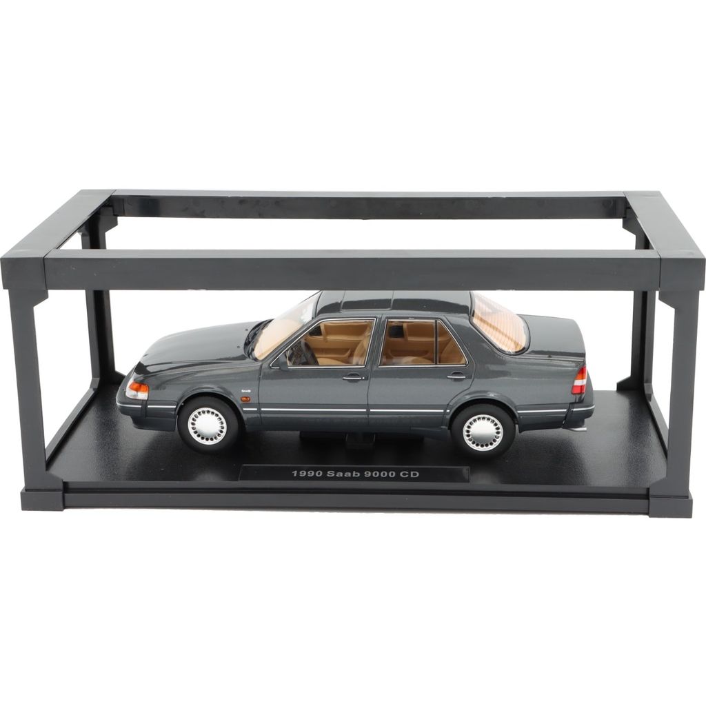 Modellen står på en svart bottenplatta med ram där texten "1990 Saab 9000 CD" i silver/grått. Ramen monteras enkelt bort för att bilen ska kunna stå prydligt hemma i hyllan eller i vitrinskåpet.
