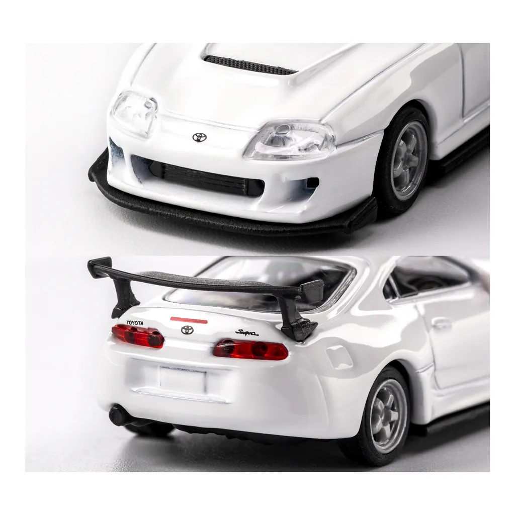 Bilen levereras stående på en svart bottenplatta med en täckande akrylbox (show case). På plattan anges modellens namn "1995 Toyota Supra" i silver.