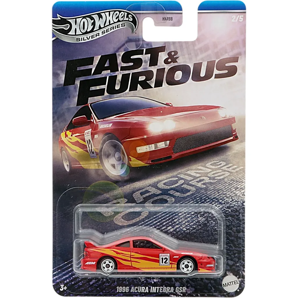 1996 Acura Integra GSR i en röd och gul lack från Fast & Furious-filmen The Fast and The Furious där den kördes av Edwin och Mia Toretto. Bilen är tillverkad av Hot Wheels i skala 1:64 (7,2 cm).