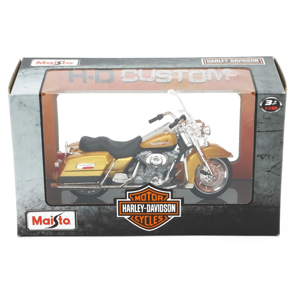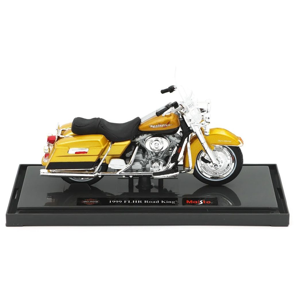 Motorcykeln är monterad på en bottenplatta med cykelns namn "1999 FLHR Road King" och Harley-Davidsons samt Maistos logotyp. Plattan får cykeln att stå fint på hyllan
