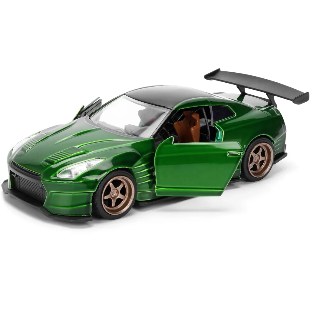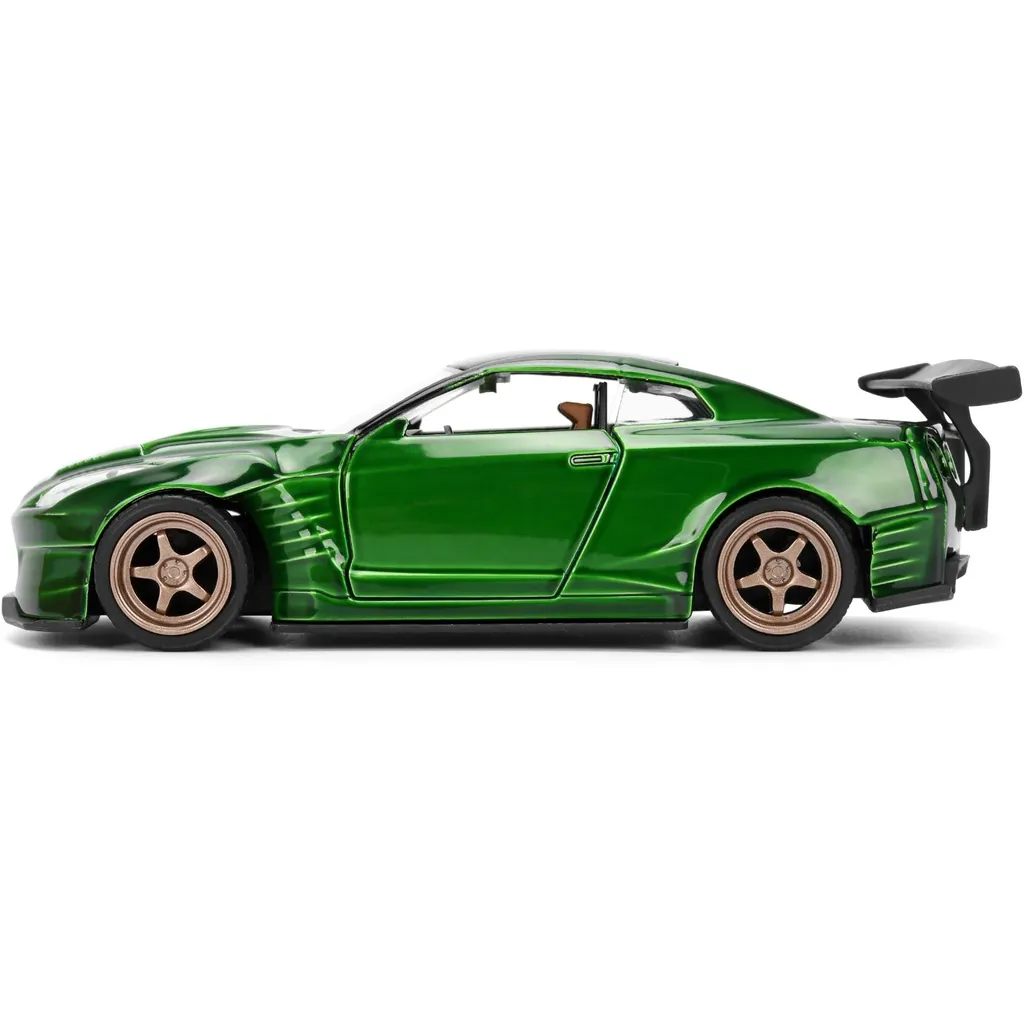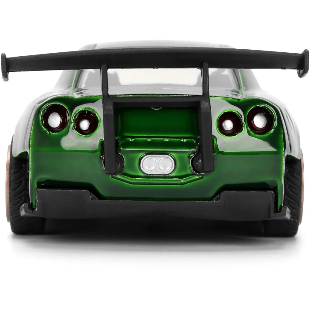 Grön 2009 Nissan GT-R (R35) med body kit från Ben Sopra och guldfälgar från Jada Toys och serien Pink Slips. Bilen är 13 cm lång (skala 1:32).