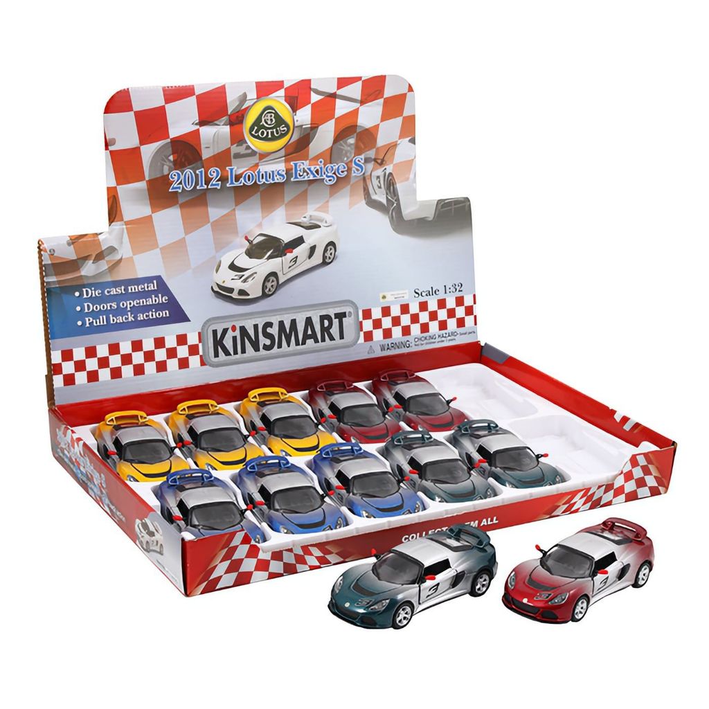 Leksaksbil från Kinsmart i form av en 2012 Lotus Exige S med öppningsbara dörrar och pullback.
