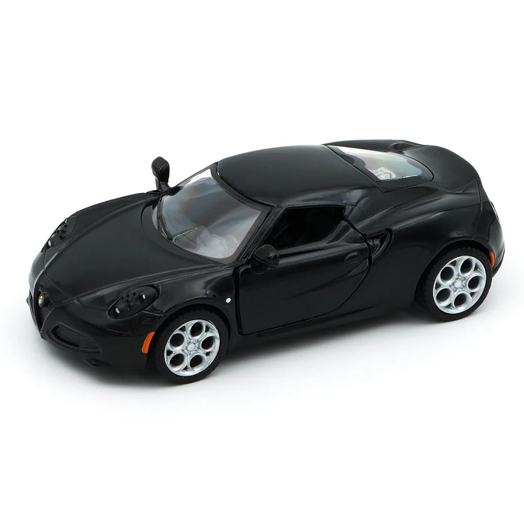 Svart 2013 Alfa Romeo 4C från Kinsmart i skala 1:32 (längd 12,5 cm).