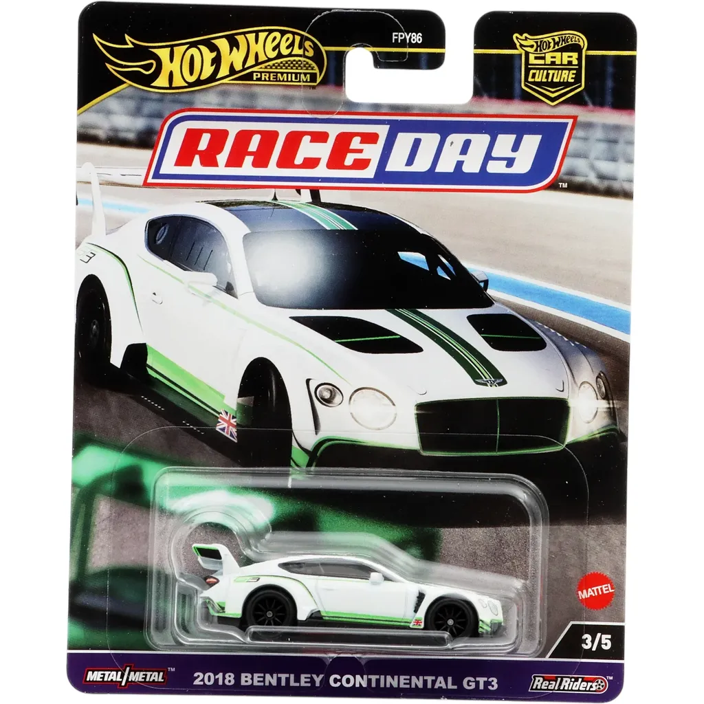 Vit 2018 Bentley Continental GT3 från Hot Wheels och setet Car Culture: Race Day från 2024 där denna bil är nummer tre av fem.