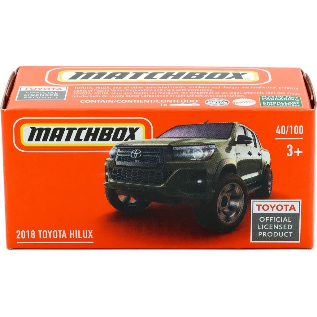 2018 Toyota Hilux från Matchbox och serien Power Grab där denna leksaksbil är bil nummer 40/100. Bilen ingår i D-case 2021.