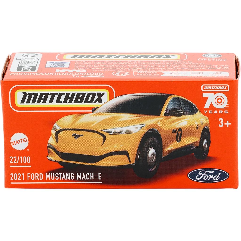 2021 Ford Mustang Mach-E (gul) som leksaksbil från Matchbox och serien Power Grab där bilen levereras i en liten kartongförpackning.