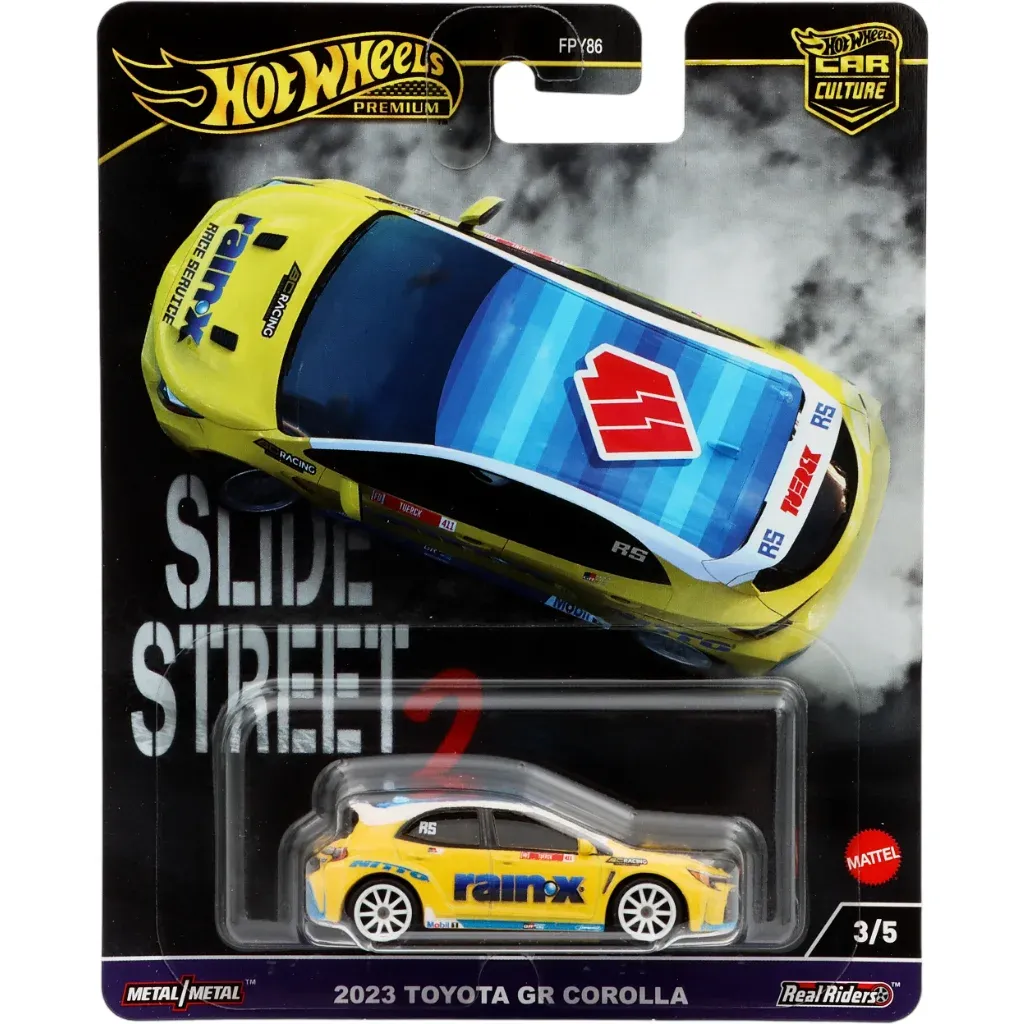 2023 Toyota GR Corolla från Hot Wheels Premium och serien Car Culture: Slide Street 2 från 2024 där denna Corolla GR är bil nummer 3 av 5 i serien.