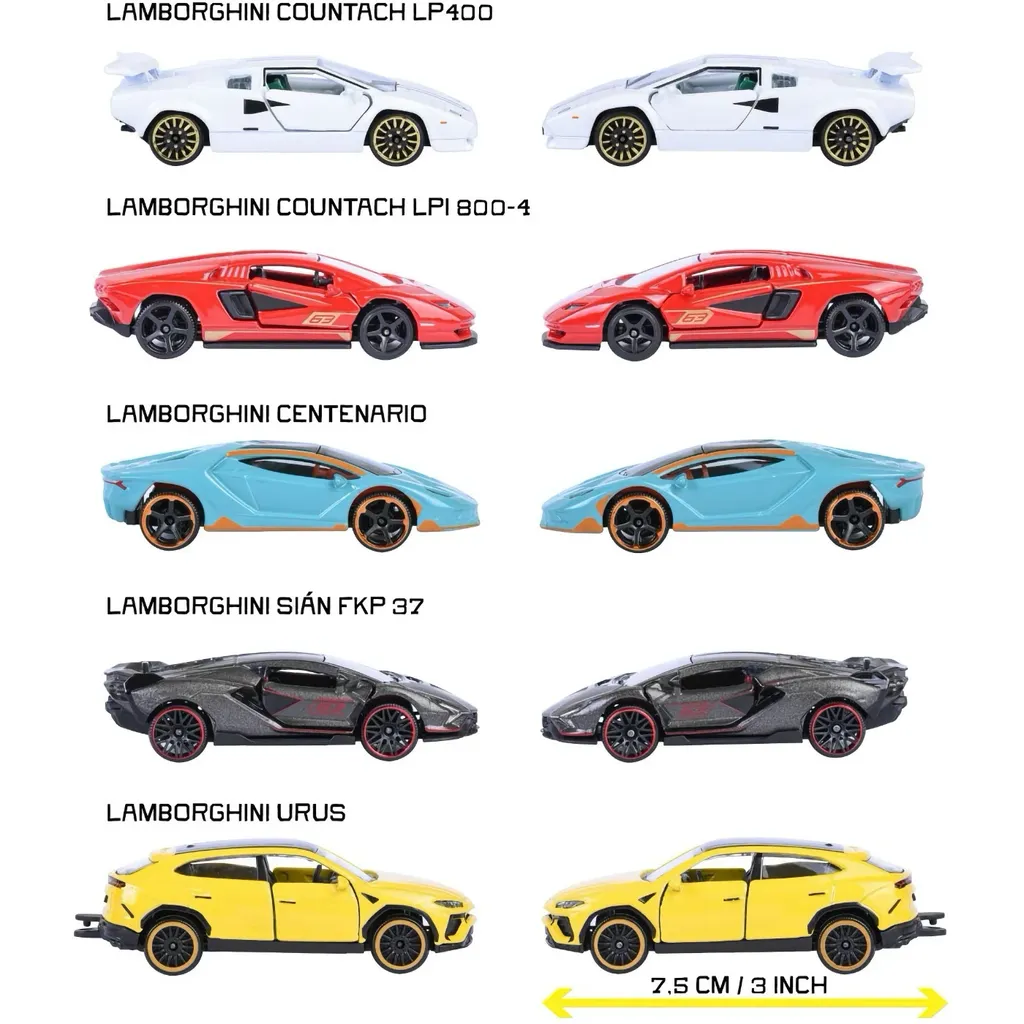 5-pack (giftpack) med Lamborghini-leksaksbilar från Majorette. Bilarna är ca 7 cm långa (ca skala 1:64) och 4 bilar har öppningsbara dörrar.