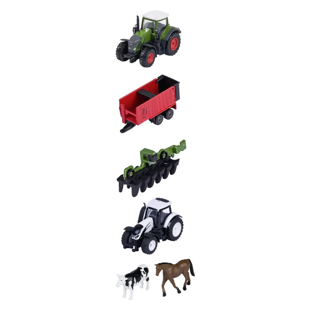 I setet ingår en Fendt 939-traktor, en Valtra T4-traktor, en lantbruksvagn, en plog, en häst och en ko.