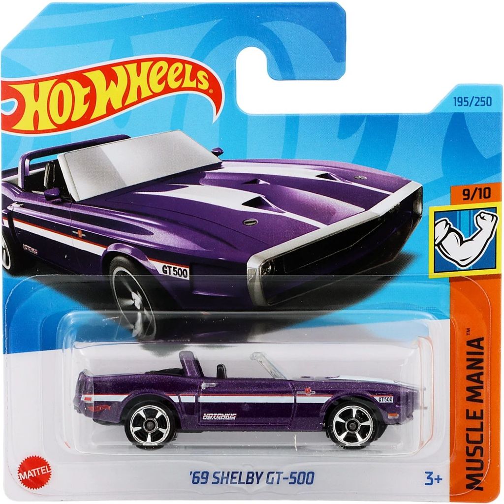 69 Shelby GT-500 från Hot Wheels och serien Muscle Mania där denna lila Shelby är bil nummer 9/10. Bilen är nummer 195/250 från 2023 och har ett short card (5785). Cabrioletens artikelnummer är HKJ50. Just denna bil ingår i bland annat L case 2023.