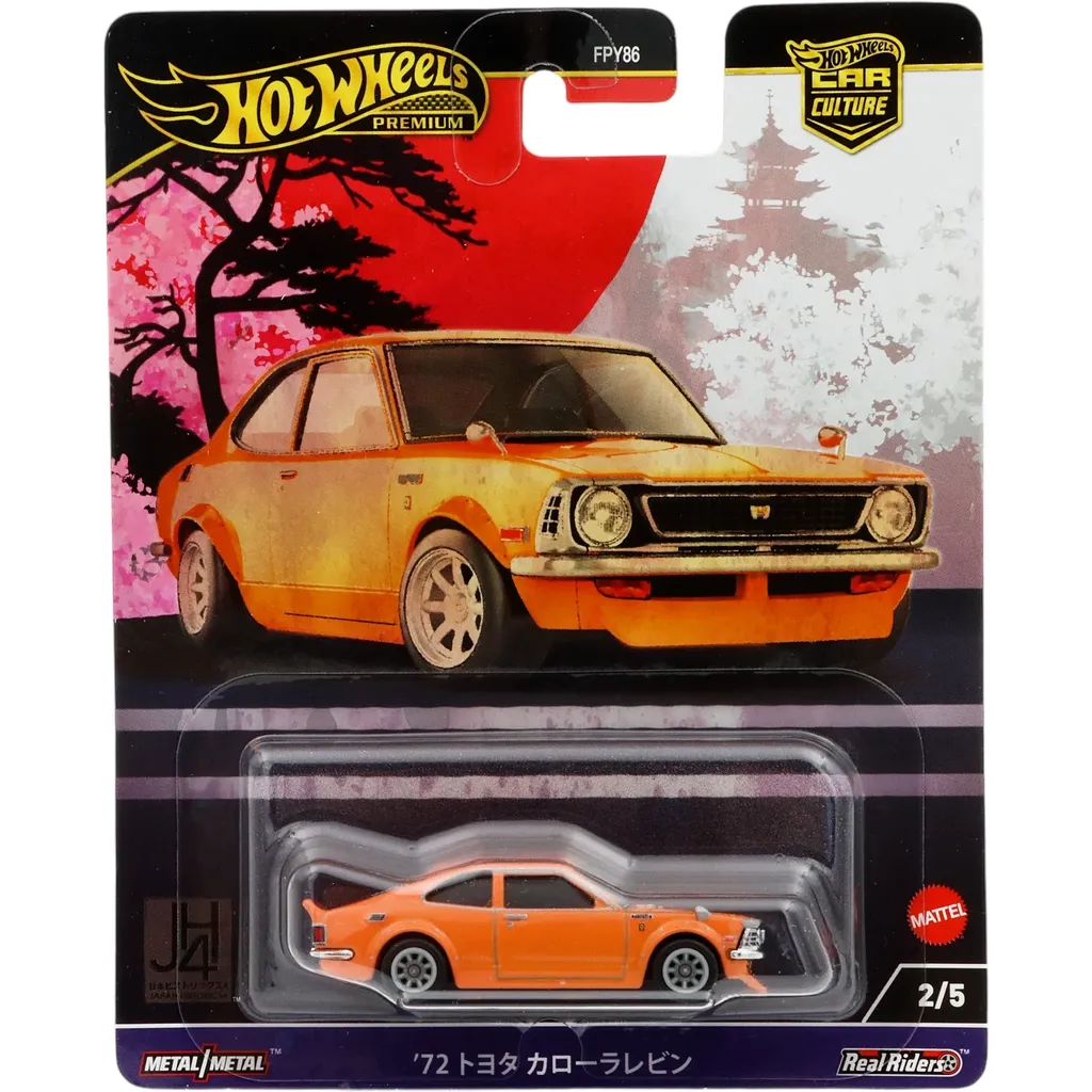Orange '72 Toyota Corolla Levin från Hot Wheels och serien Japan Historics 4 från 2024 där denna bil är nummer två av fem.