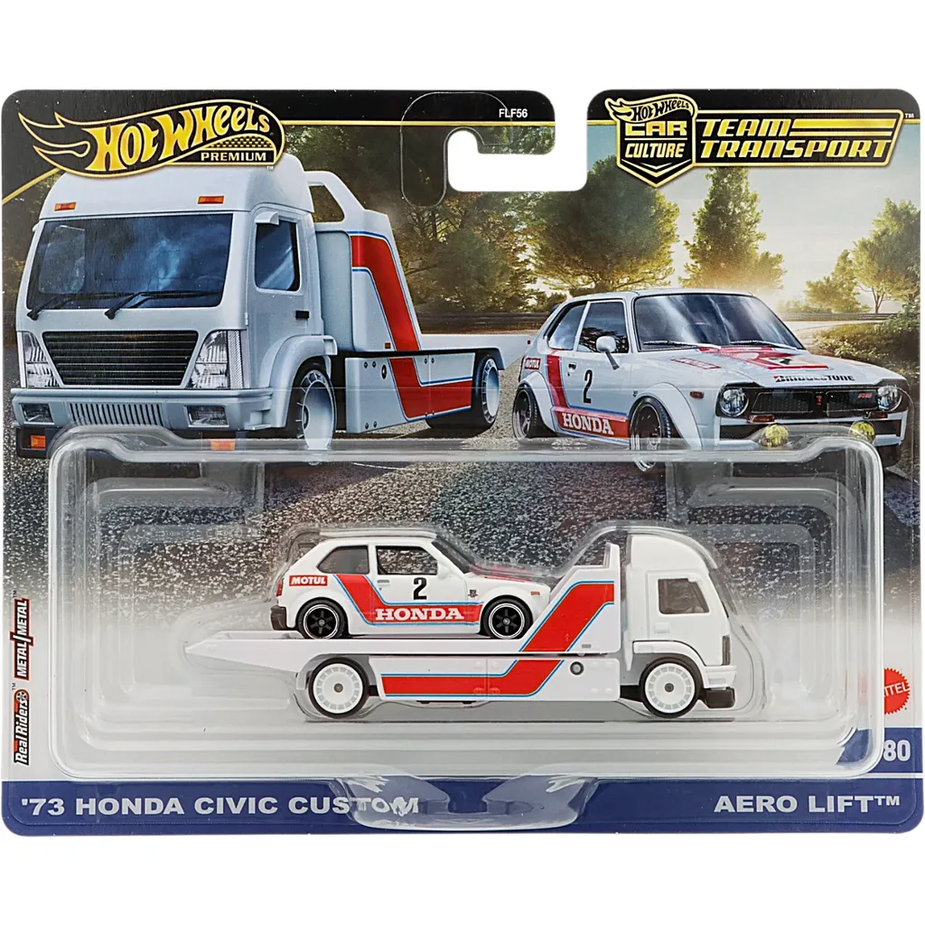 Team Transporten '73 Honda Civic Custom + transportbilen Aero Lift från Hot Wheels Premium. Denna Car Culture: Team Transport har nummer #80 i transportserien.
