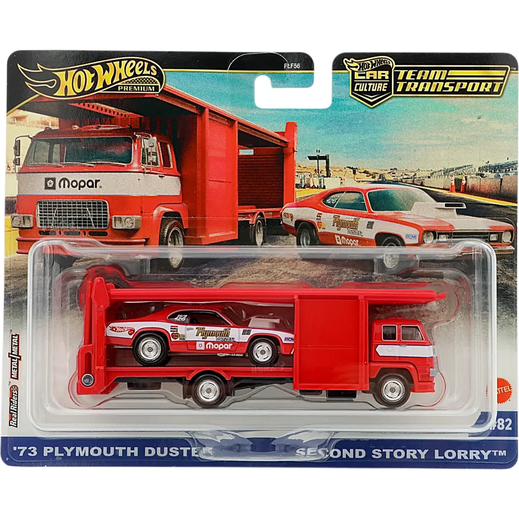 Team Transporten '73 Plymouth Duster + transportbilen Second Story Lorry från Hot Wheels Premium. Denna Car Culture: Team Transport har nummer #82 i transportserien.