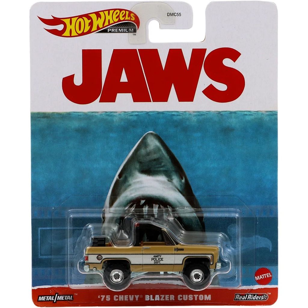 '75 Chevy Blazer Custom från filmen Hajen (JAWS på engelska) från Hot Wheels. Chevan ingår i setet Hot Wheels Entertainment från 2023, Mix 3.