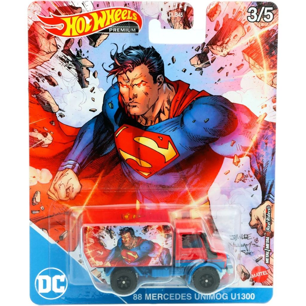 88 Mercedes Unimog U1300 från Hot Wheels med motiv av karaktären Superman (Stålmannen). Bilen ingår i setet Pop Culture: DC Comics från 2021, där denna Mercedes Unimog är bil nummer 3 av 5.