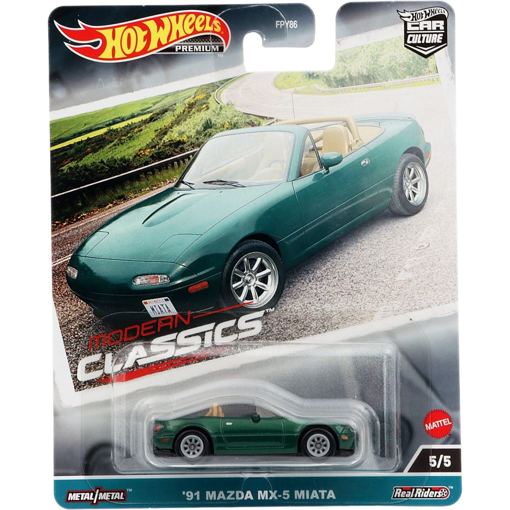 Grön '91 Mazda MX-5 Miata från Hot Wheels och serien Car Culture: Modern Classics från 2023 där denna Miata är bil 5 av 5 i setet.
