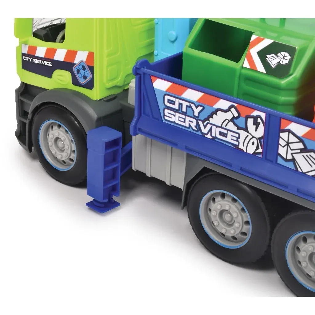 Återvinningslastbil med 2 st containrar och kran från Dickie Toys. Ljud och ljus. Bilen är 24 cm lång.