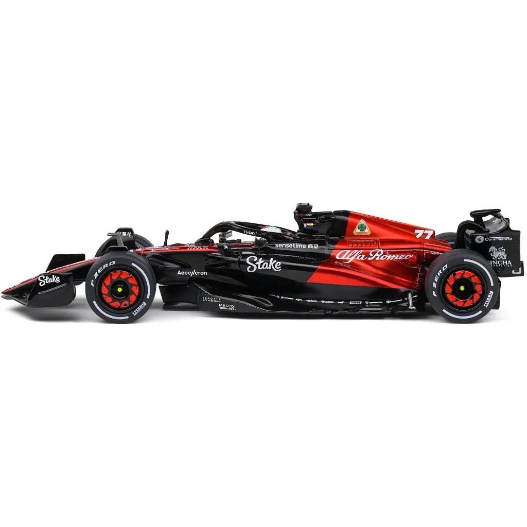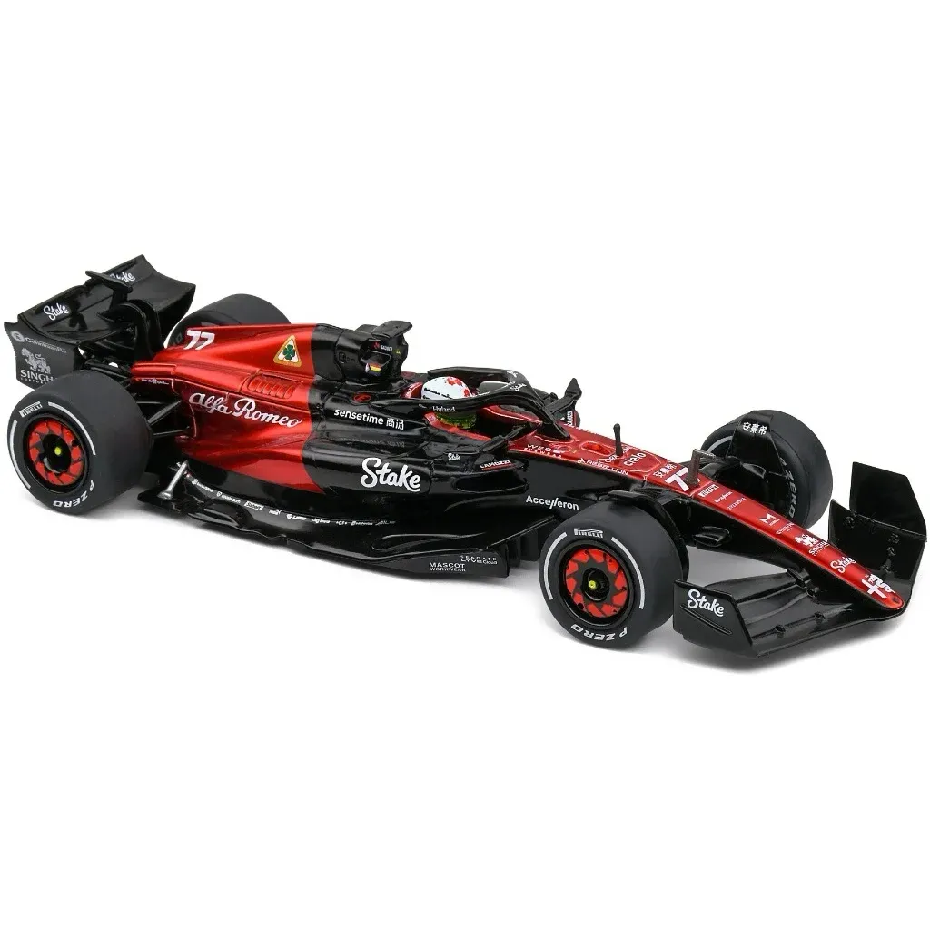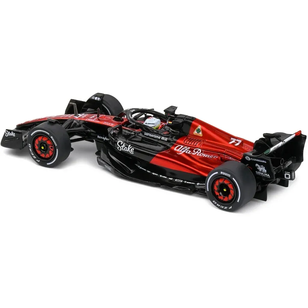 Modell av formel 1-bilen C43 från Alfa Romeo tillverkad av Solido i skala 1:43 (13 cm). Just denna bil, med denna livery och nummer 77, kördes under Canadian GP 2023 av Valtteri Bottas.