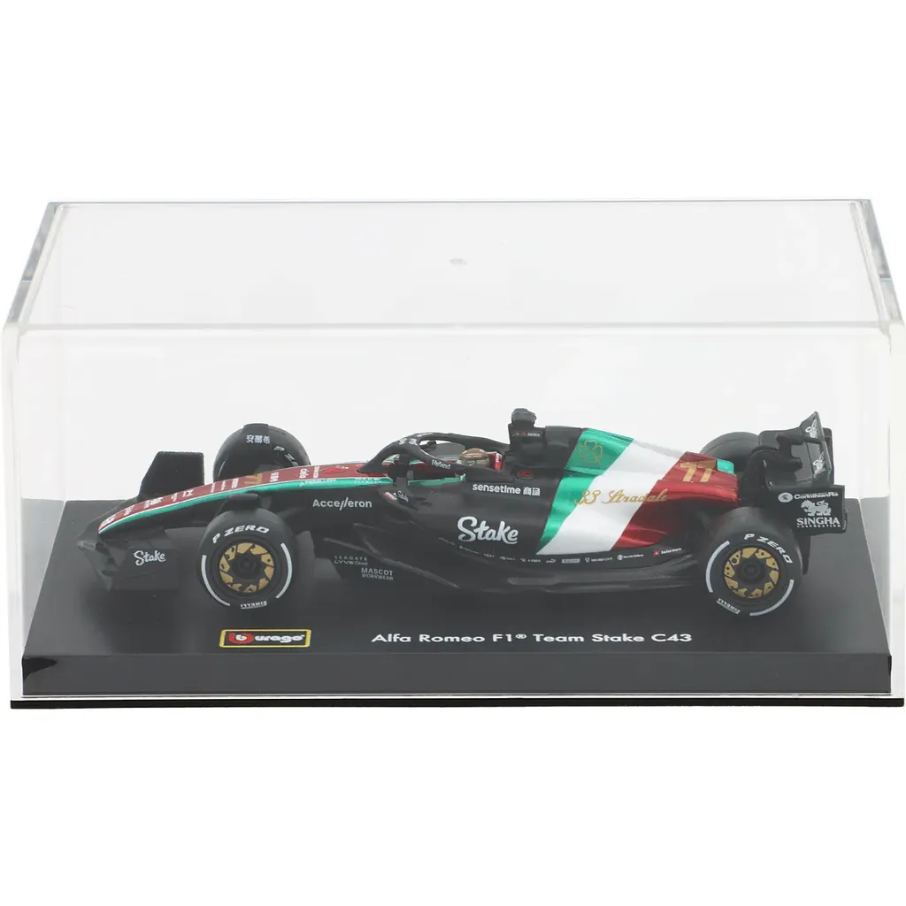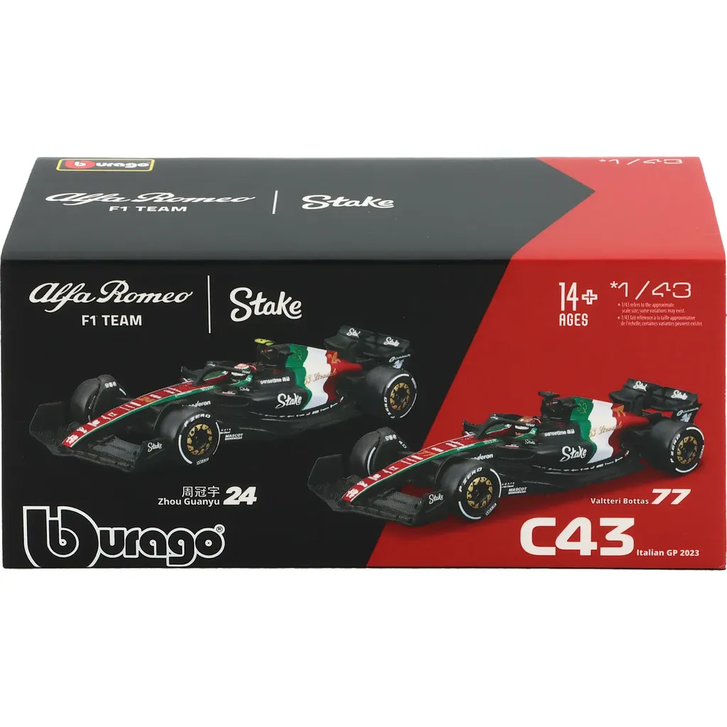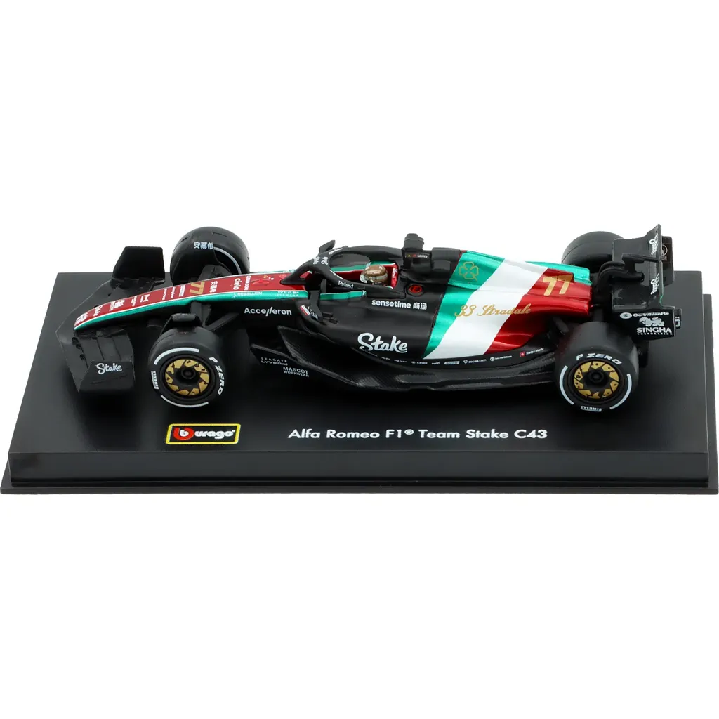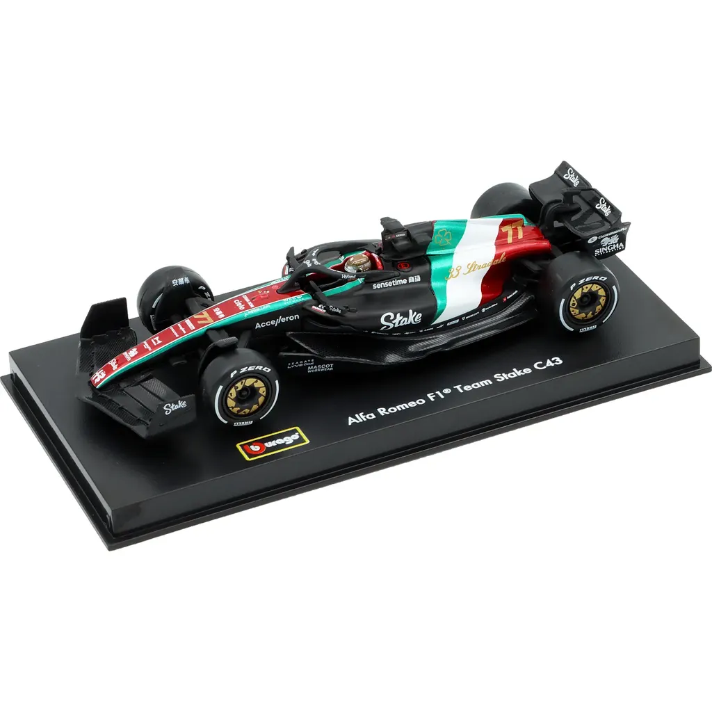 Modell av formel 1-bilen C43 från Alfa Romeo. Denna bil, med nummer 77, kördes under Italian GP 2023 av Valtteri Bottas som slutade på tionde plats under racet som vanns av Max Verstappen. Bilen ingår i teamet Alfa Romeo F1 Team Stake från Hinwil i Schweiz.
