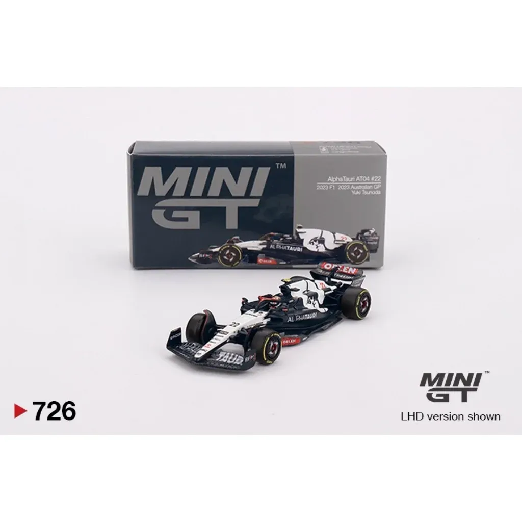 AlphaTauri AT04 #22 2023 F1 Australian GP Yuki Tsunoda som modell från Mini GT i skala 1:64 (ca 7 cm).