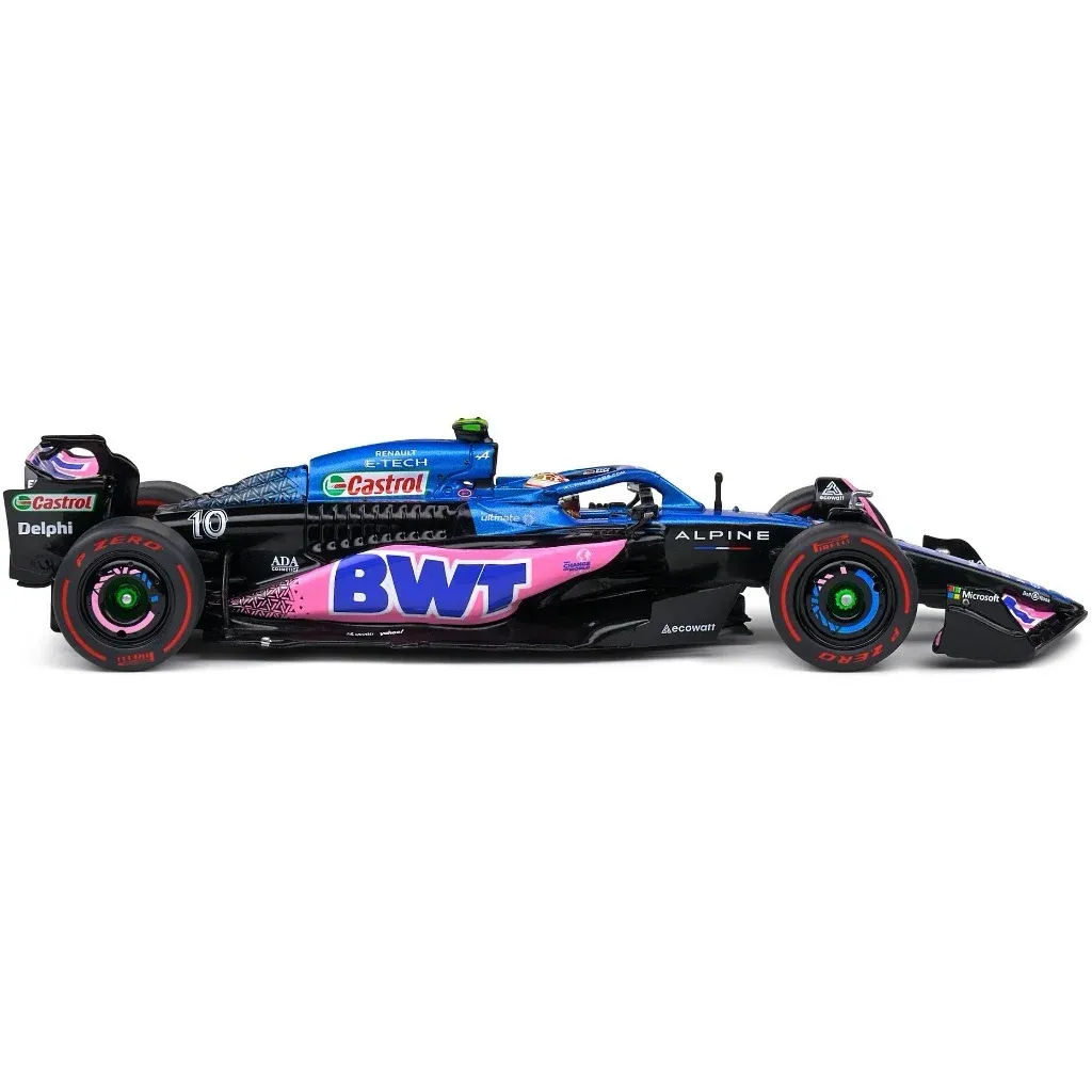 Modell av formel 1-bilen A523 från Alpine tillverkad av Solido i skala 1:43 (13 cm). Just denna bil, med denna livery och nummer 10, kördes under Dutch GP 2023 av Pierre Gasly.
